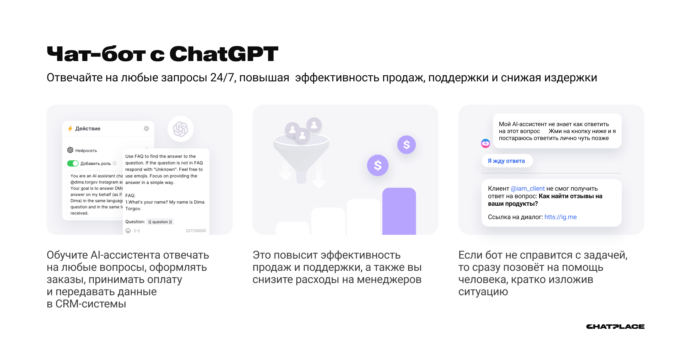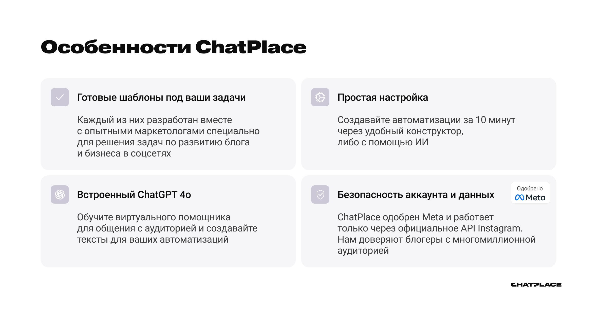 *Деятельность Meta Platforms Inc. (Facebook, Instagram) запрещена на территории Российской ФедерацииОсновные возможности ChatPlace: