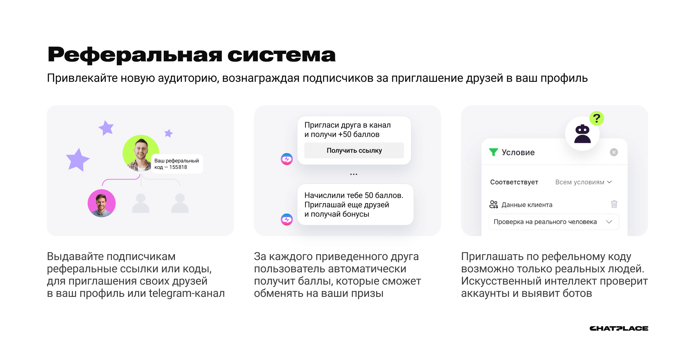 Реферальная система: Привлекайте новую аудиторию по рекомендациям подписчиков и партнеров.