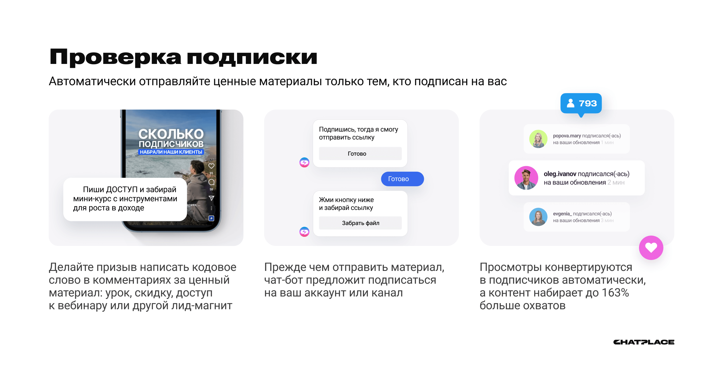 Чат-боты с проверкой подписки: Получайте на 163% больше охватов и конвертируйте просмотры в подписчиков.