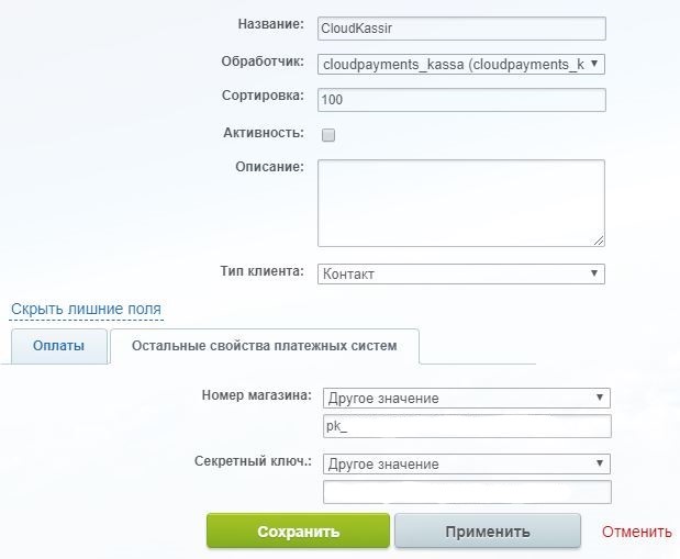 Если вы используете платежный модуль CloudPayments совместно с модулем CloudKassir, то убедитесь, что в платежном модуле отключена отправка чеков через онлайн-кассу, во избежание дублирования кассовых чеков.