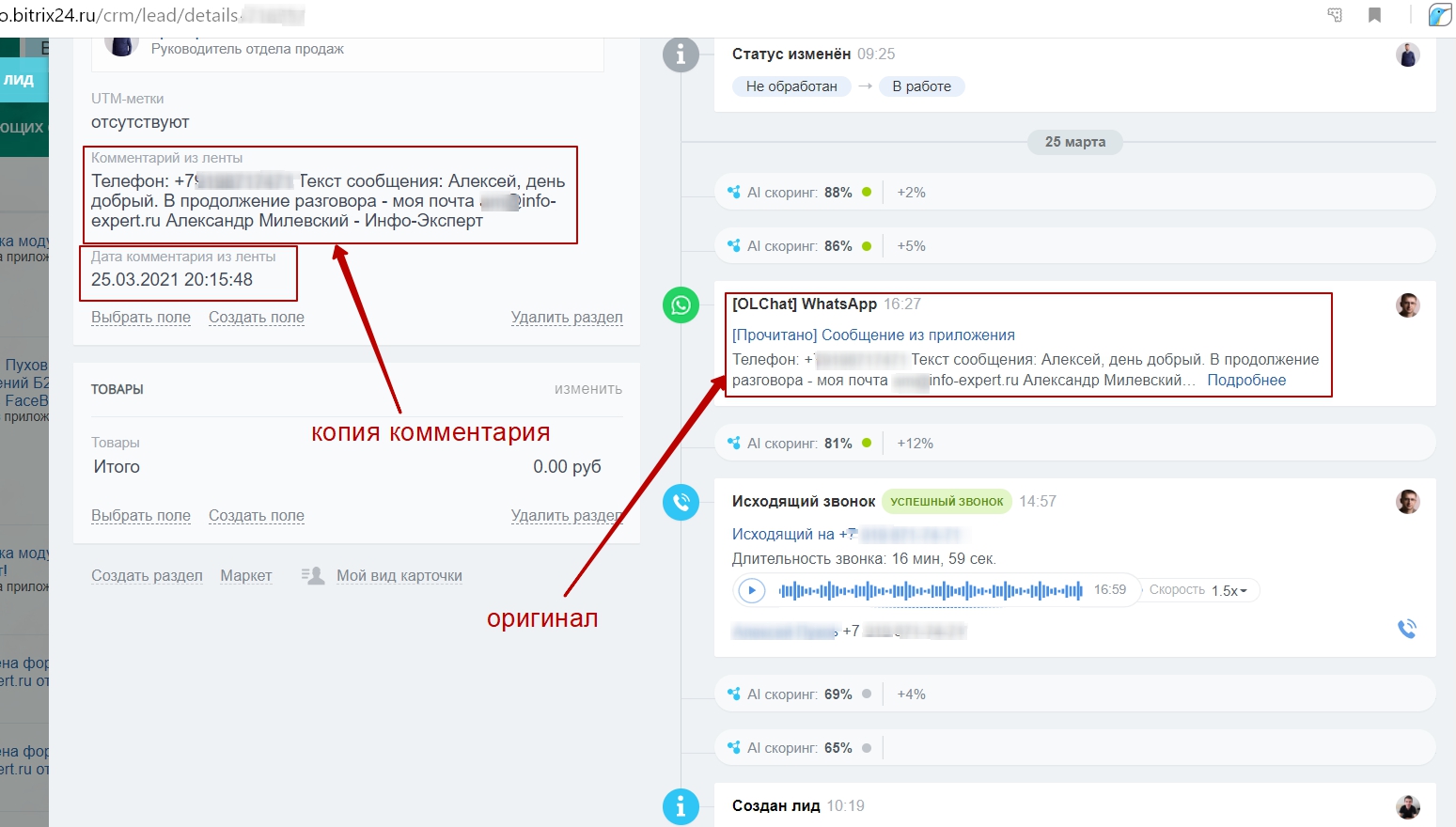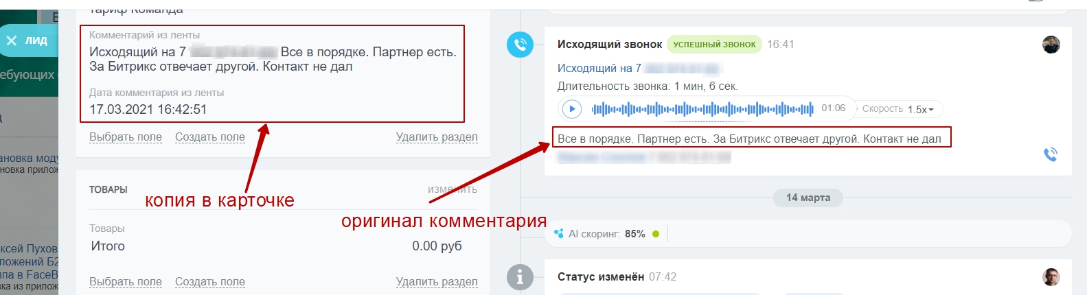 Ассистент переносит комментарии из Дел в поле карточки CRM. Теперь очень удобно следить за всем в Канбане.