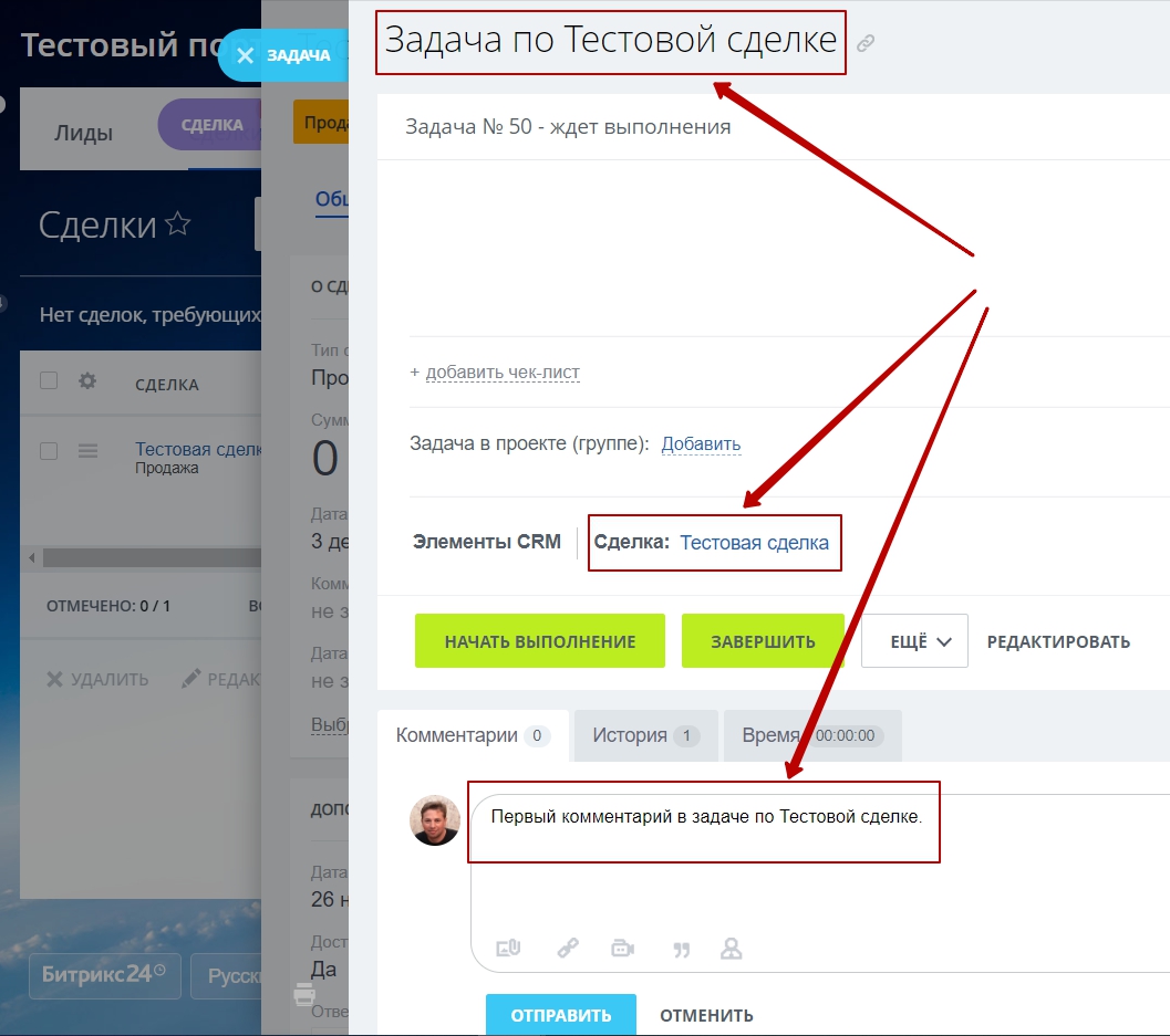 Теперь, как только в задаче, привязанной к любому из элементов CRM, будет добавлен комментарий, эта информация копируется в таймлайн Лида / Контакта / Компании / Сделки / Заказа.