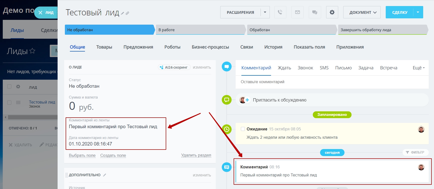 Этот комментарий автоматически будет скопирован в пользовательское поле Лида, Контакта, Компании или Сделки.