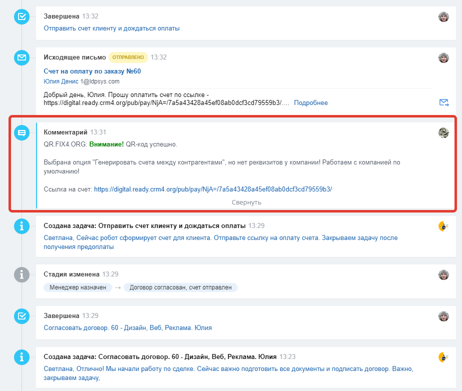 Правая часть карточки представляем из себя информационную ленту, в которой отображается история в хронологическом порядке. Все события, комментарии, записи телефонных переговоров, оповещения, SMS сообщения, переписка в социальных сетях, электронная почтовая переписка, задачи и дела.