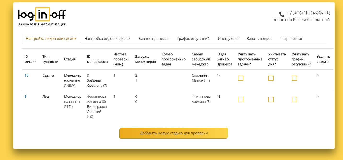 - Автоматически и равномерно распределяет нагрузку между сотрудниками (лидов, сделок, задач) без личного участия руководителя отдела или старшего смены.