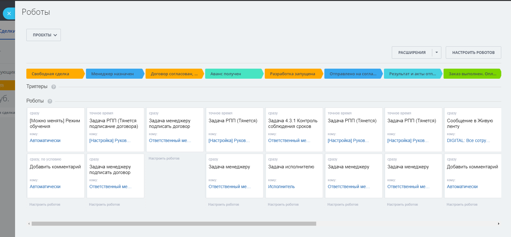 - Ответственный согласно поставленным задачам – чек листам приступает к работе и по мере сопровождения передвигает сделку на очередной этап-статус.
