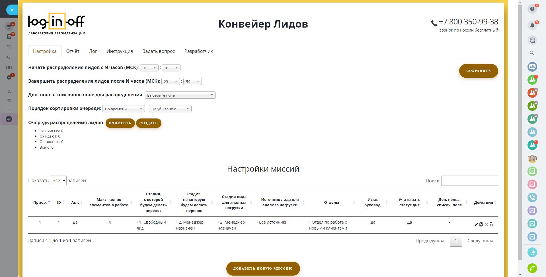 Автоматическое распределение лидов по сотрудникам на отдел, с учетом их рабочего дня и нагрузки.