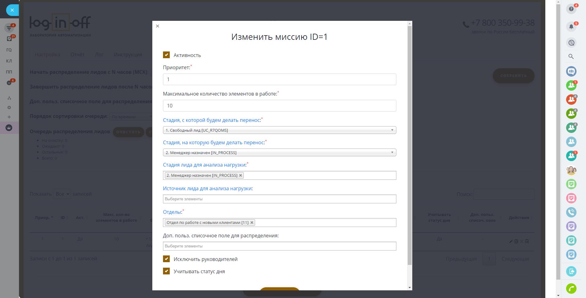 До тех пор, пока менеджер не продвинет свои лиды дальше по воронке, система будет "спать". И только когда на указанных стадиях освободится место — автоматически добавит менеджеру для работы новые лиды из очереди. При этом система проверит статус рабочего дня сотрудника.