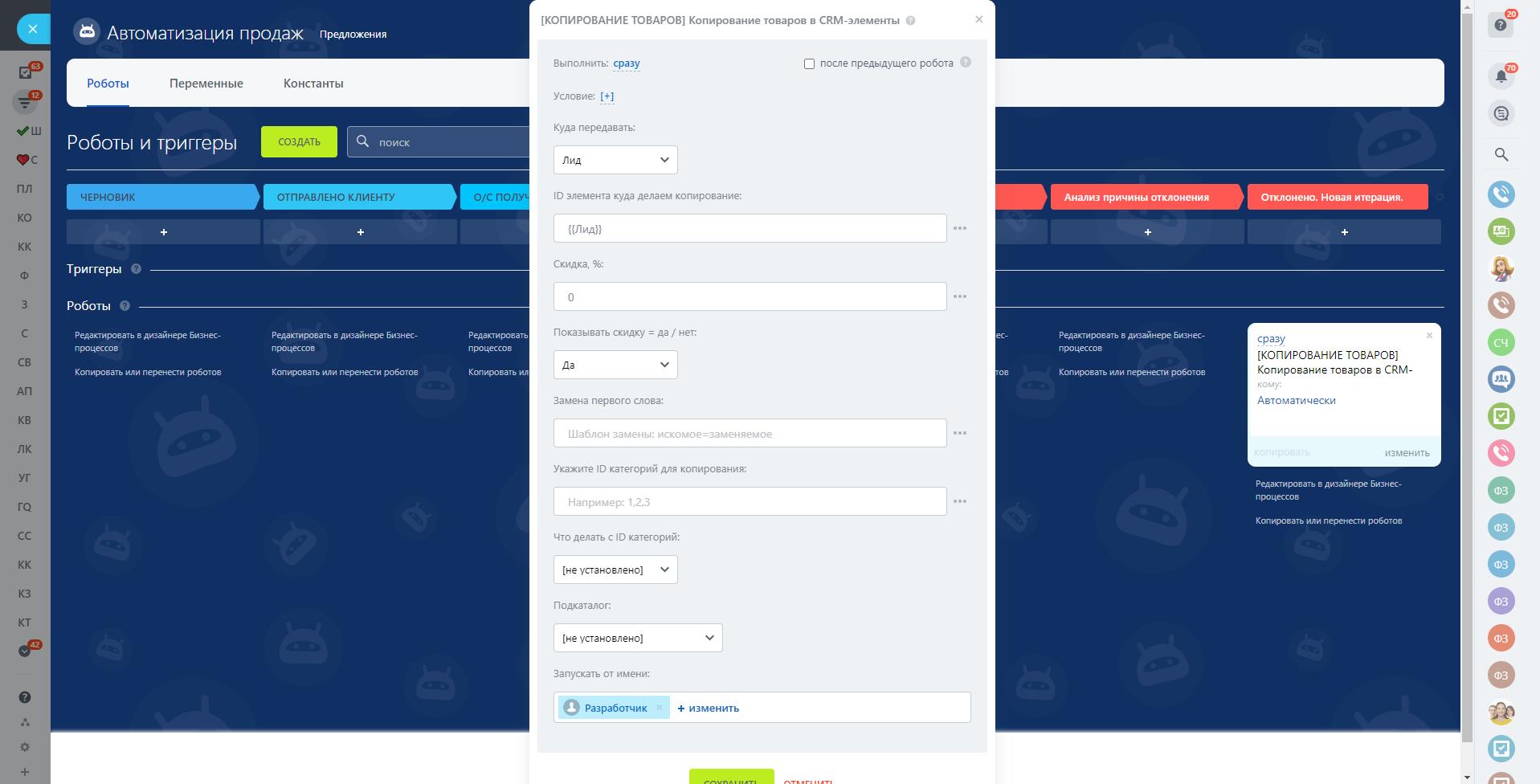 Робот позволяющий легко и быстро копировать товары между различными сущностями: лиды, сделки, счета и предложения.