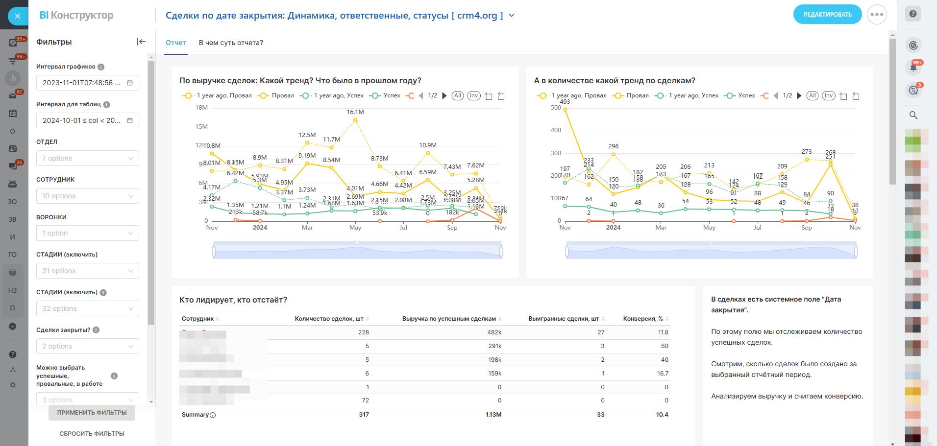 А еще — разбивка по сотрудникам с конверсией и выручкой. Удобно для анализа эффективности работы каждого.