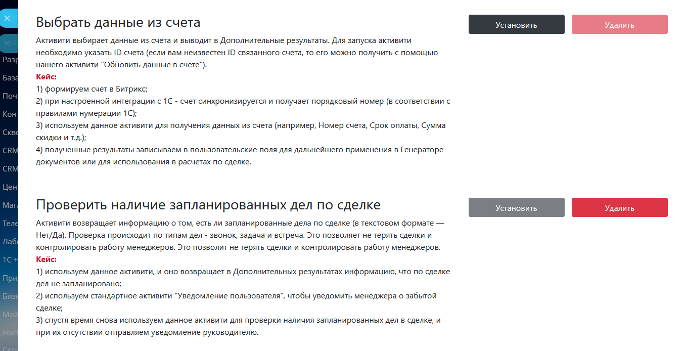 Приложение расширяет набор активити в бизнес-процессах для работы с разделами CRM, Задачи, Пользователи, Смарт-процессы