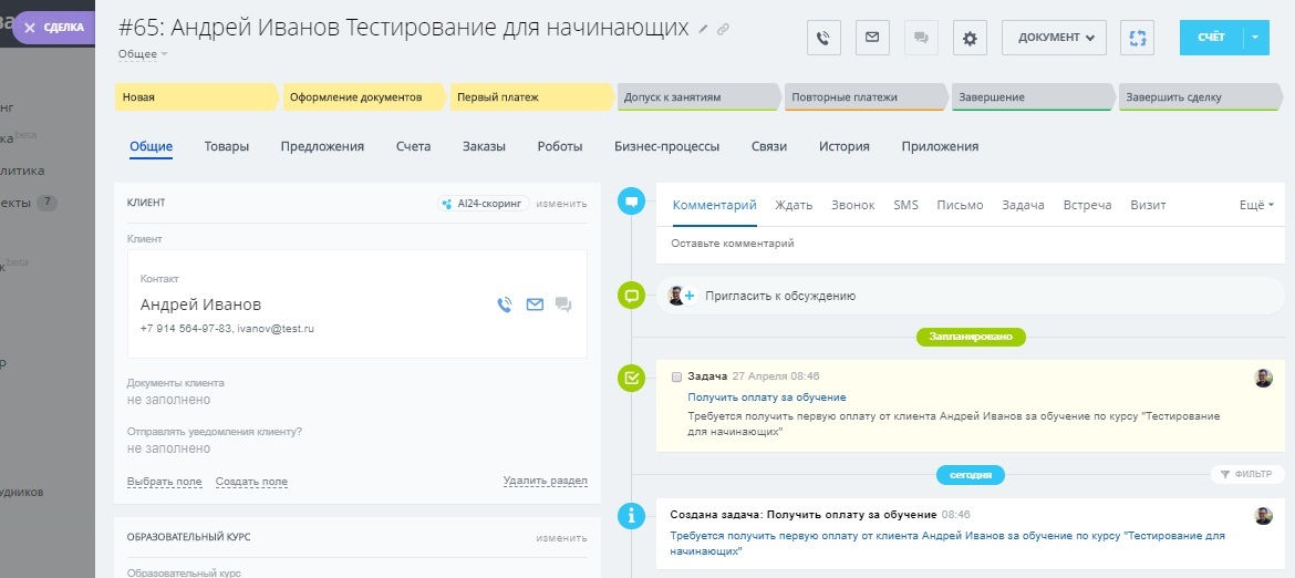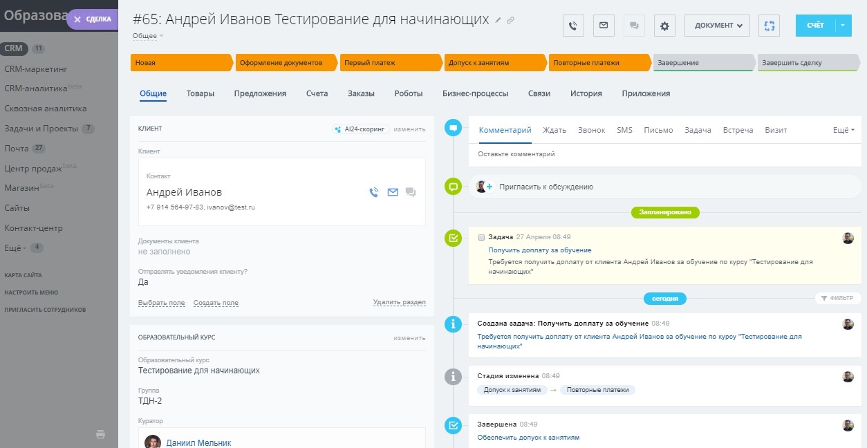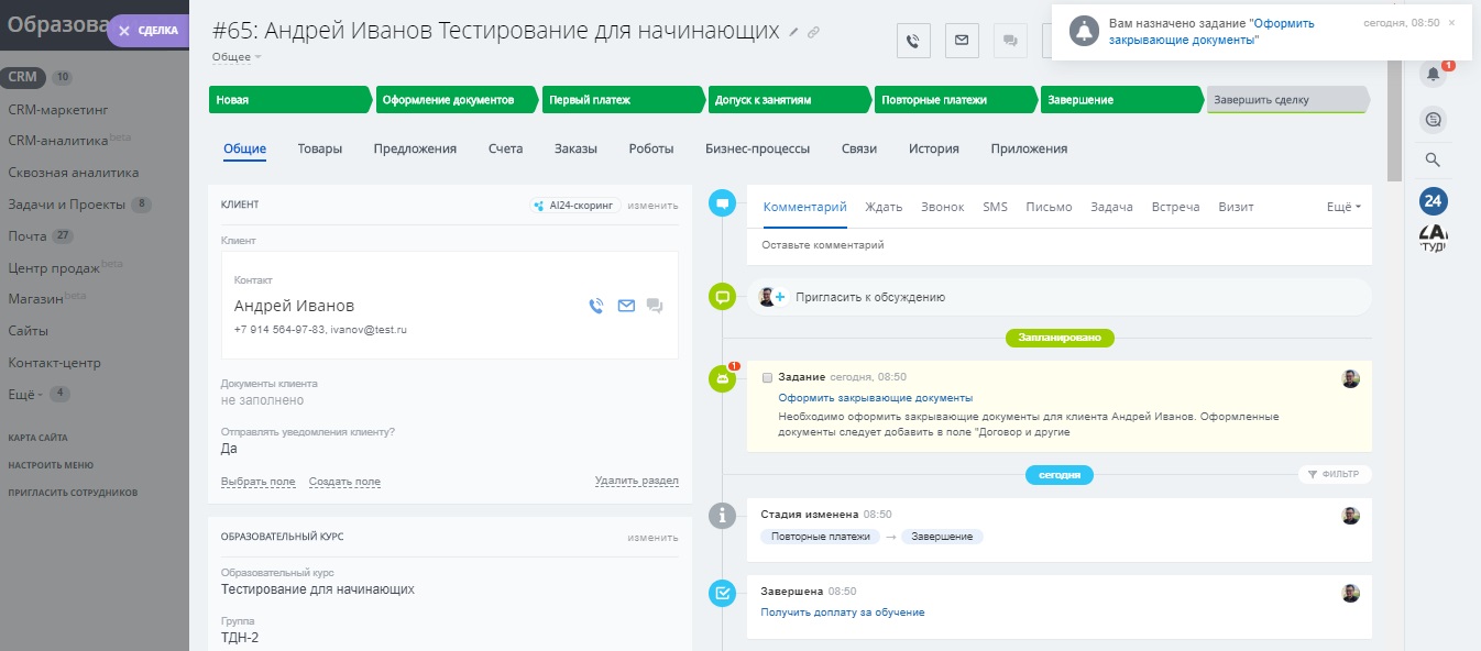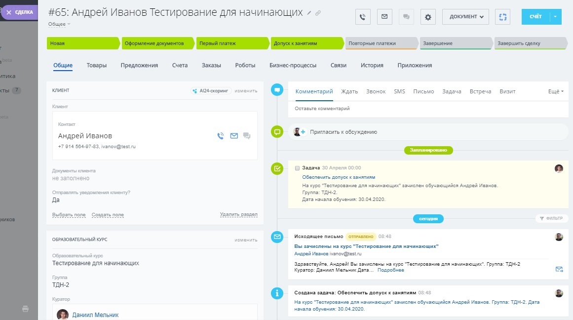- автоматическая постановка задач на контроль оплаты за обучение, заданий на оформление закрывающих документов;