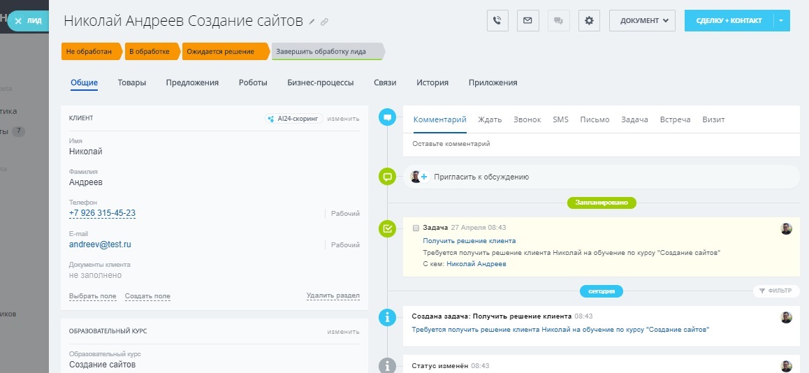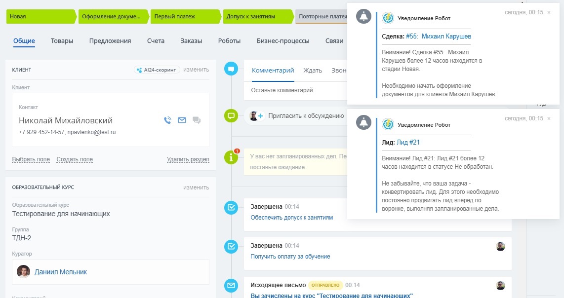 После регистрации активируются роботы переименования лида (по имени клиента и названию образовательного курса), уведомлений и контроля его своевременной обработки.