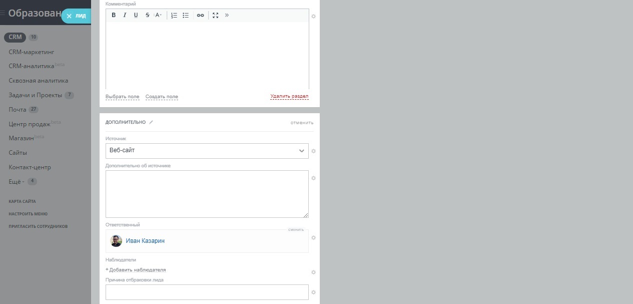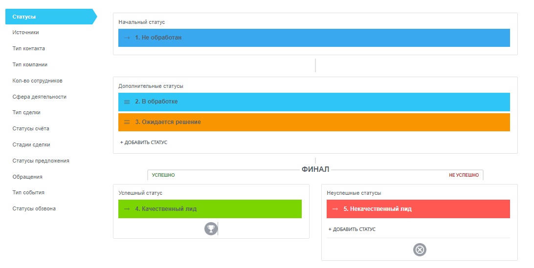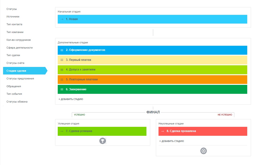 - работа с заявкой по настроенным стадиям лидов и сделок;