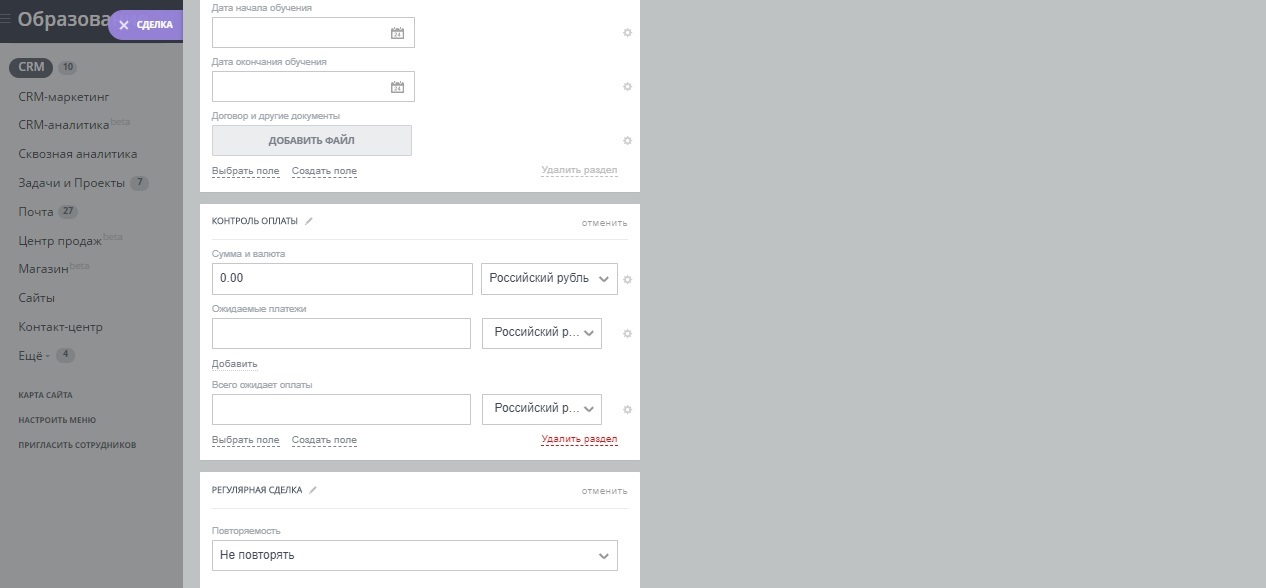 Модуль автоматически обновляет информацию о курсе обучения в карточке контакта, автоматически рассчитывает сумму оставшихся платежей за обучение.