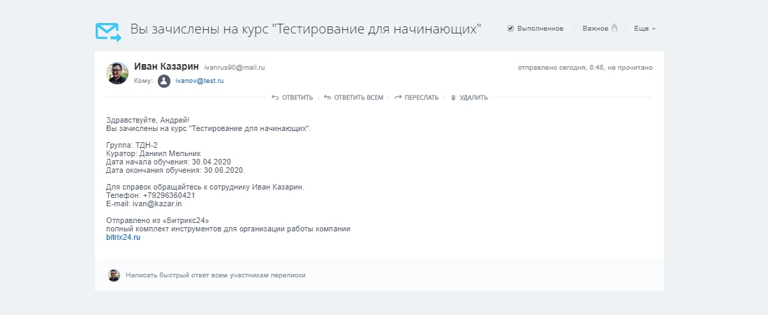 - отправка клиентам персональных e-mail-оповещений о зачислении на учебный курс;