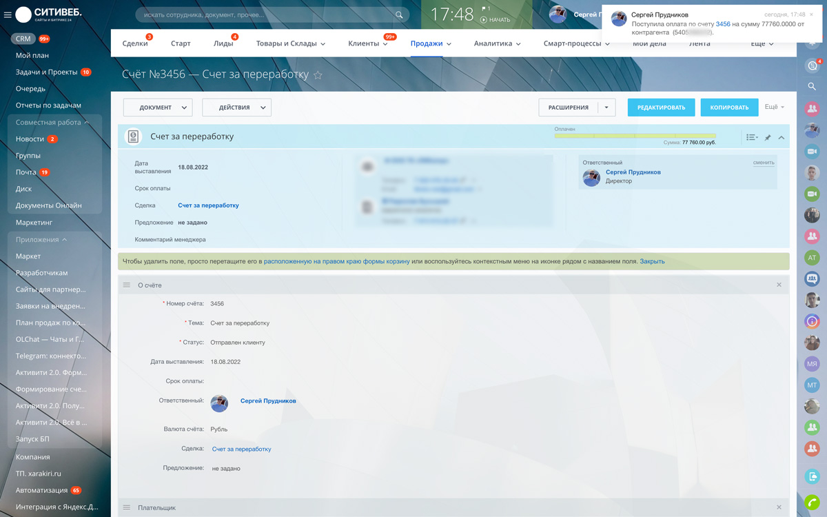 полный доступ: чтение, добавление, изменение и удаление лидов, контактов, компаний, сделок, счетов, коммерческих предложений, дел, пользовательских полей и т.д.