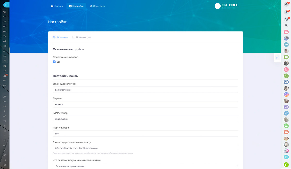 - В настройках приложения указываете параметры для для подключения к почтовому ящику.