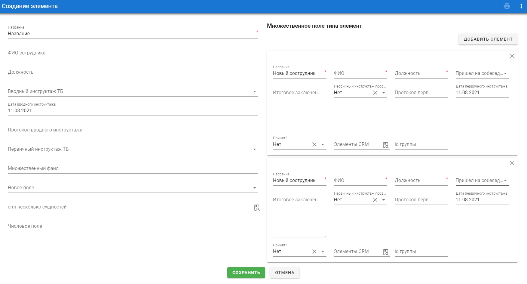 В приложении доступны абсолютно все типы полей, которые есть в Битрикс24. Также присутствует уникальная возможность редактирования полей внутри DC:Списки, для каждого типа поля она своя, отображение видимости полей по конкретному условию. Группировать поля можно по разделам.