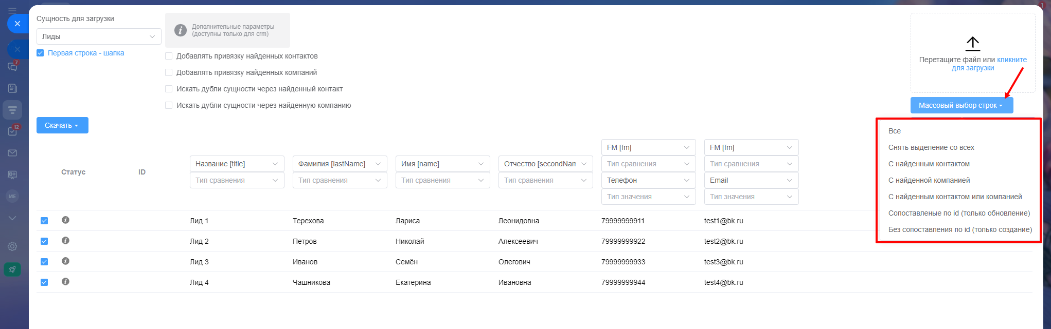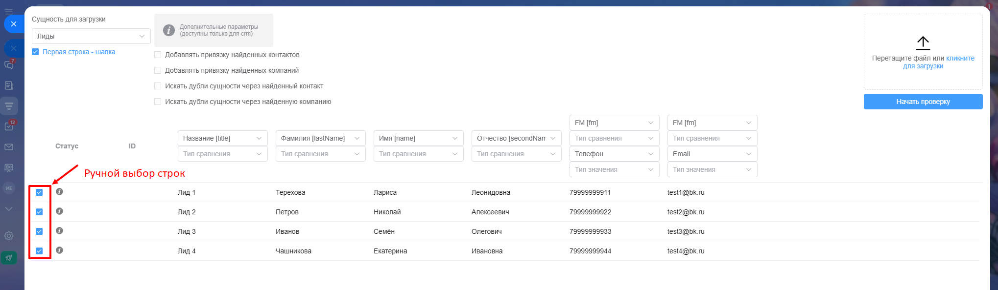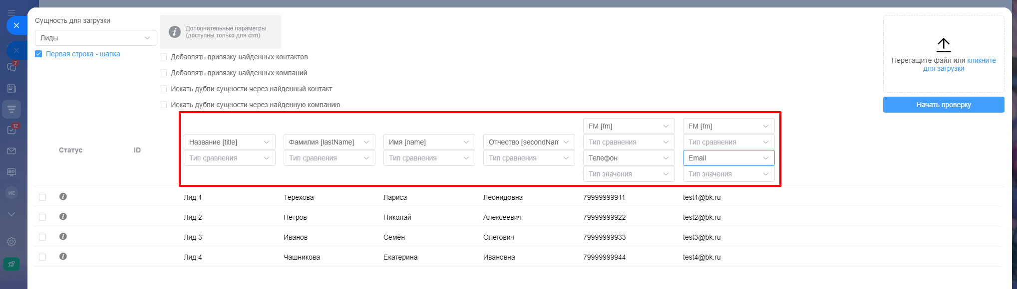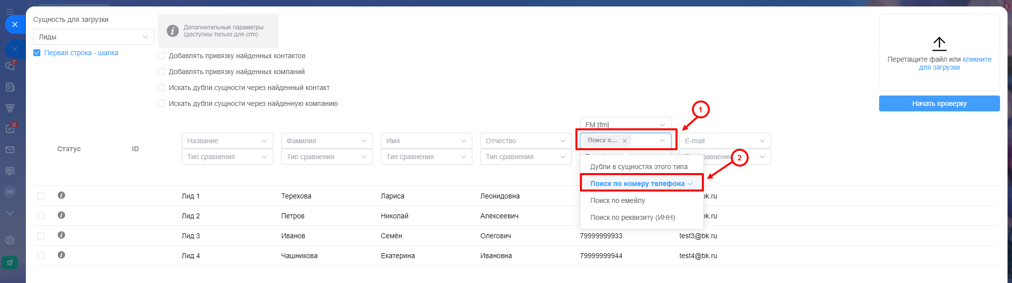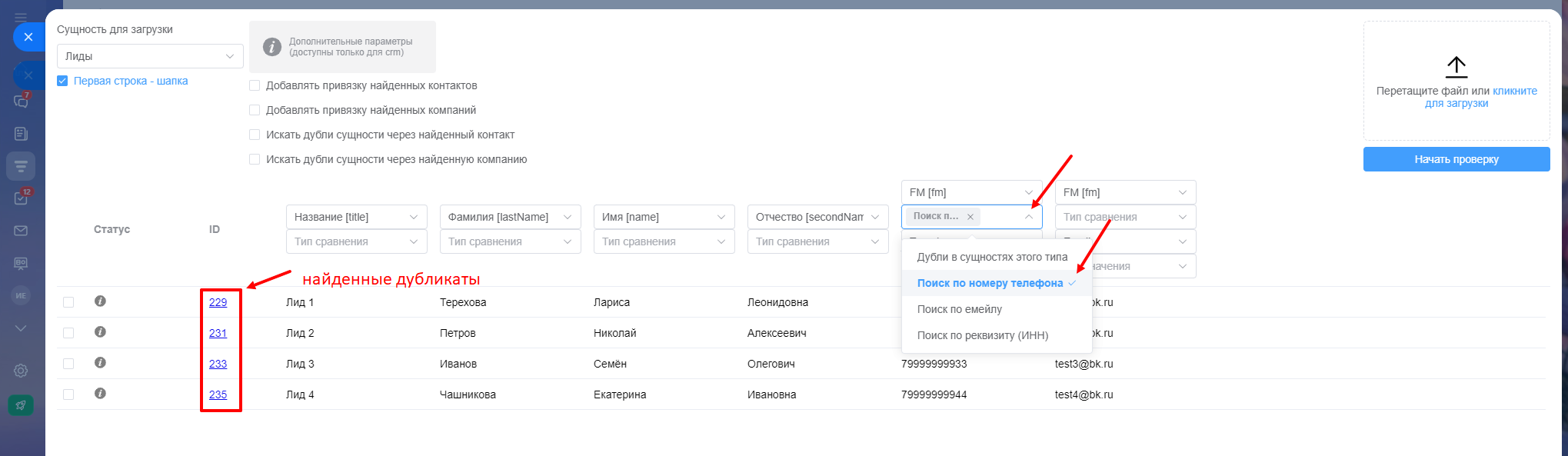 Примечание: Если в файле есть, например, номер телефона лида, можно проверить дубли не только среди лидов, но и среди Контактов и Компаний: