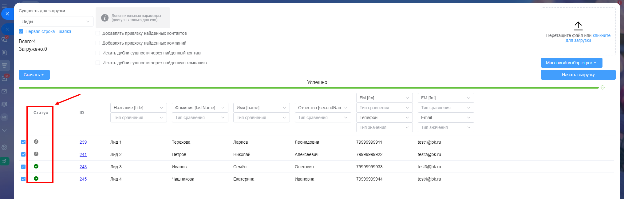 7. После завершения система покажет количество загруженных элементов. В колонке «Статус» можно отследить состояние каждой строки. Вы можете скачать файл с итогами импорта.