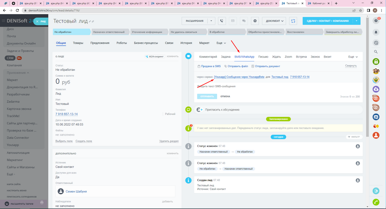 - Подключение коннектора для СМС (возможность первому отправить сообщение из карточки)!