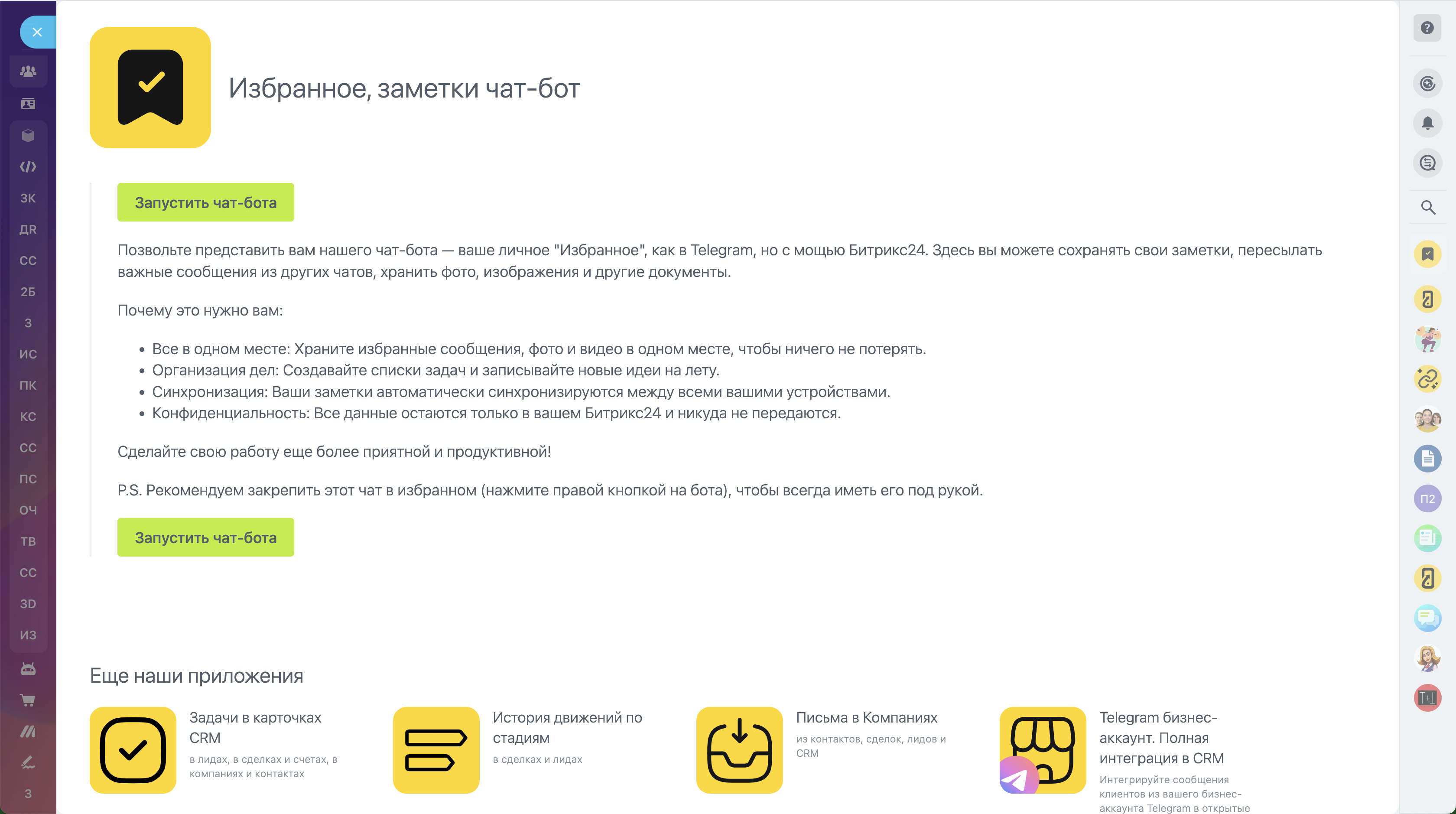 Позвольте представить вам нашего чат-бота — ваше личное "Избранное", как в Telegram, но с мощью Битрикс24. Здесь вы можете сохранять свои заметки, пересылать важные сообщения из других чатов, хранить фото, изображения и другие документы.