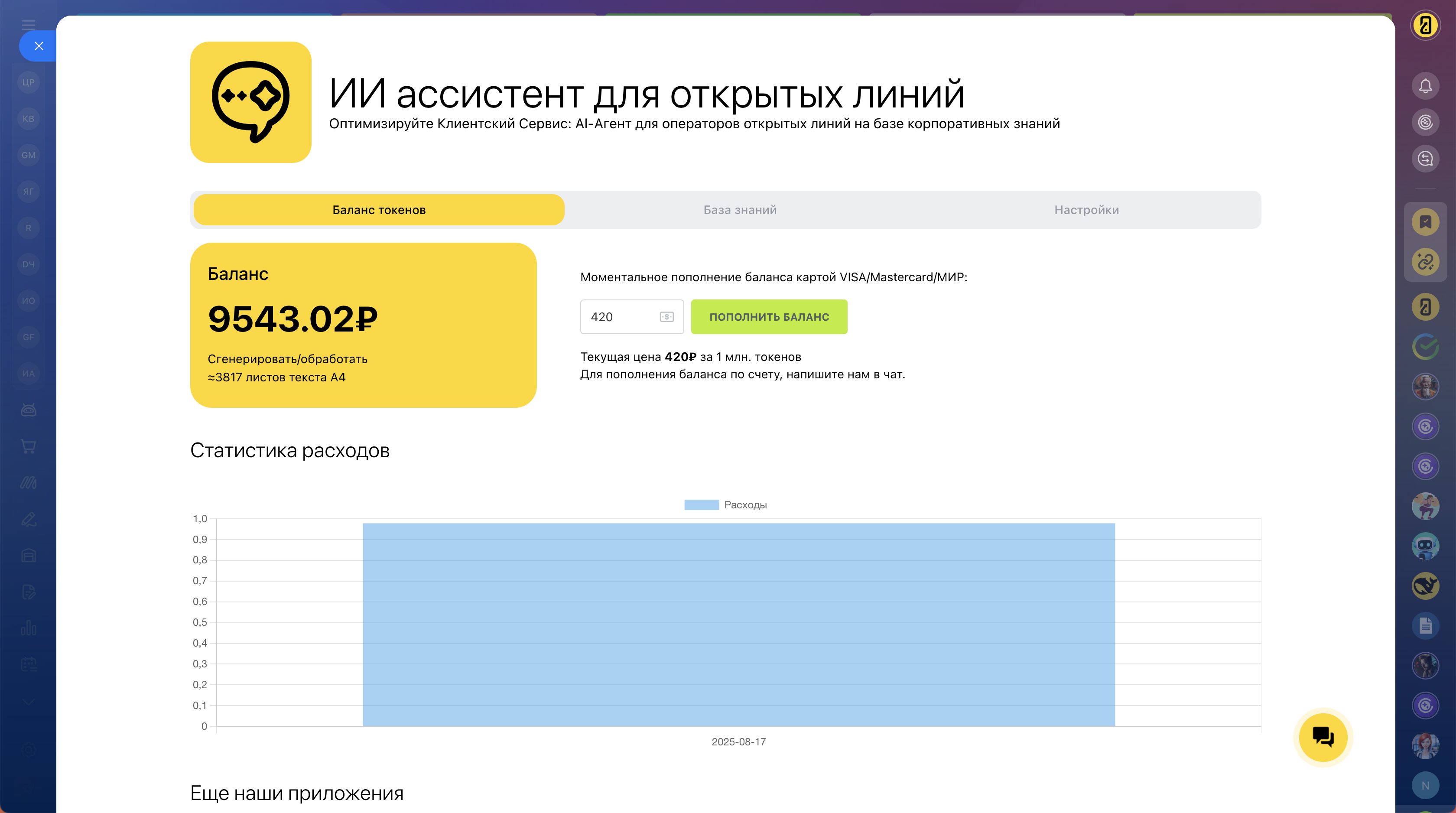 Стоимость использования: всего 420 рублей за 1 миллион токенов. Пополните баланс мгновенно прямо в приложении через удобную онлайн-оплату.