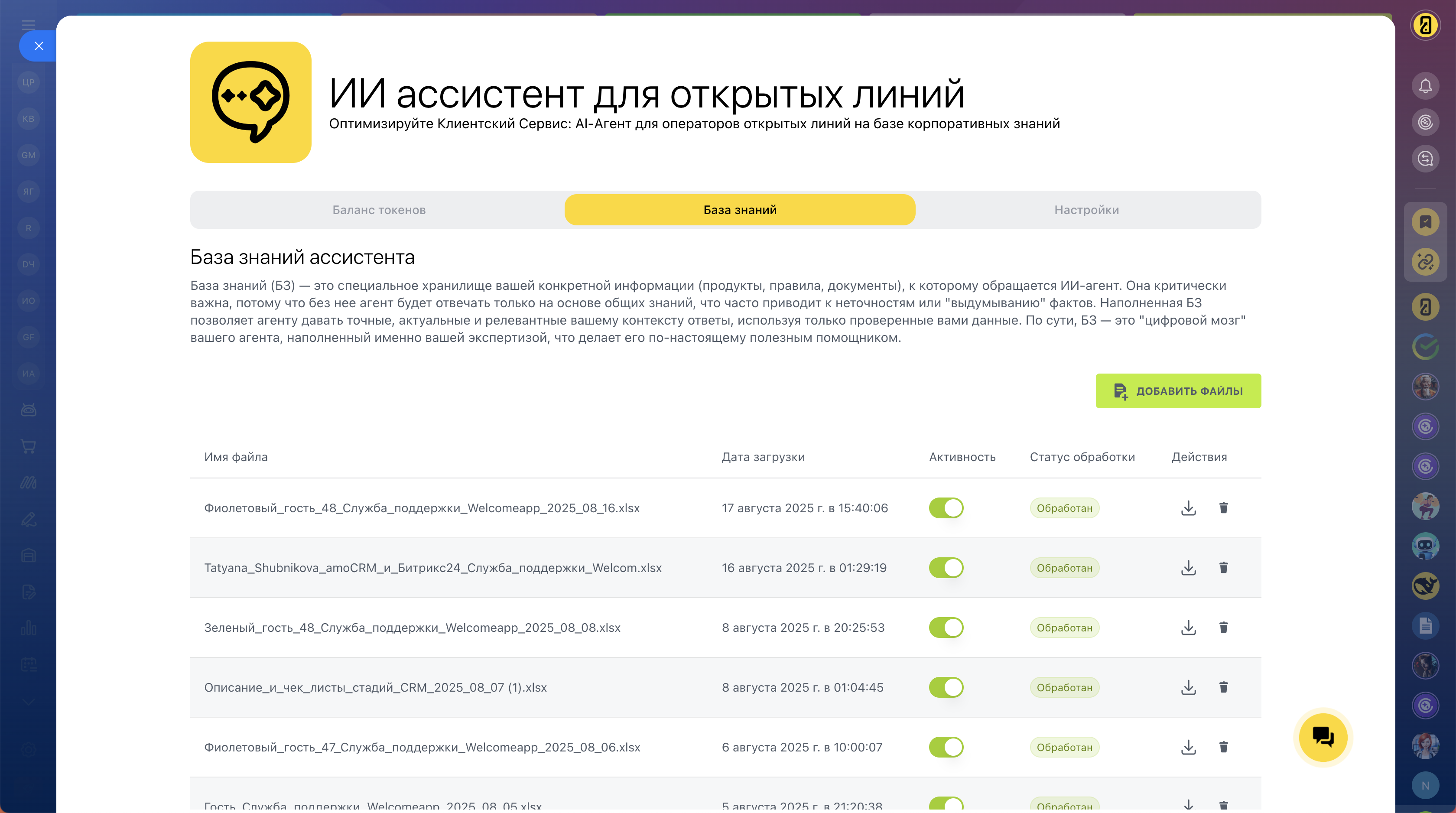 - Загрузите свою экспертизу: Добавьте любые файлы — PDF, Word, Excel, инструкции, старые диалоги. Ваша база знаний становится умнее с каждым новым документом.