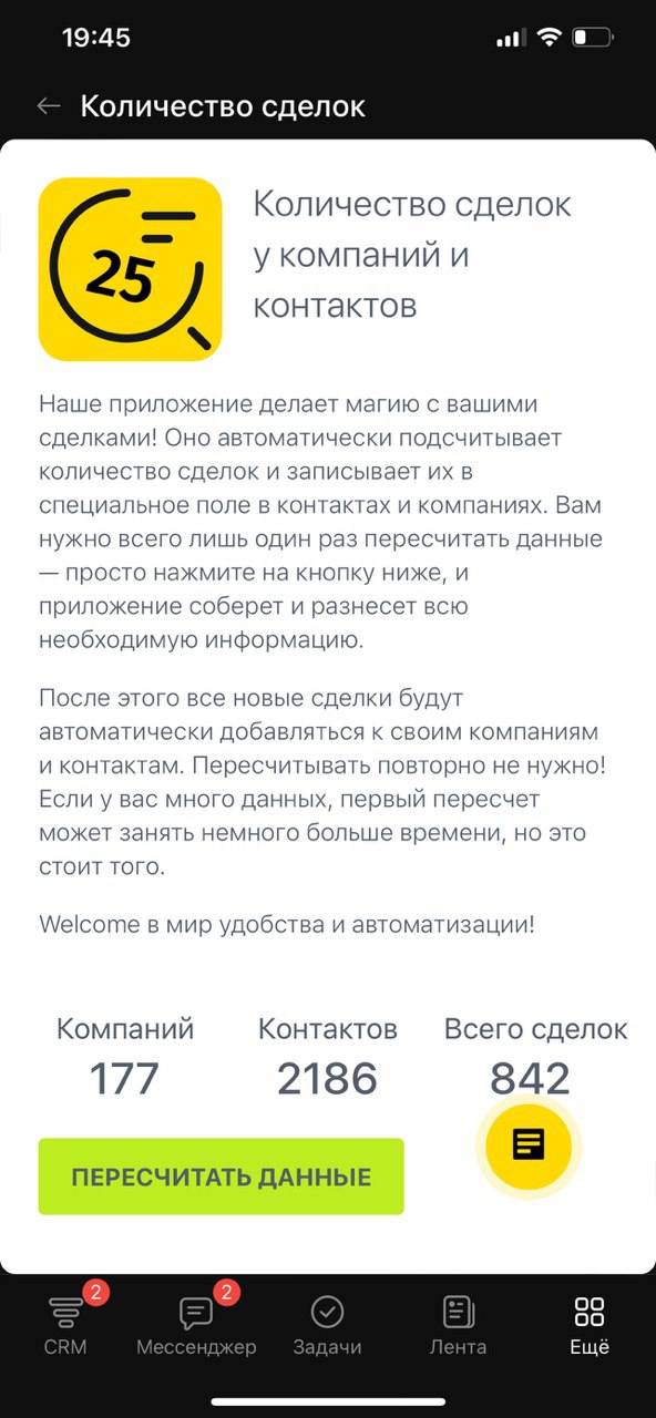 После первичного заполнения поля «Количество сделок» приложение автоматически будет обновлять данные при появлении новых сделок или их удалении.