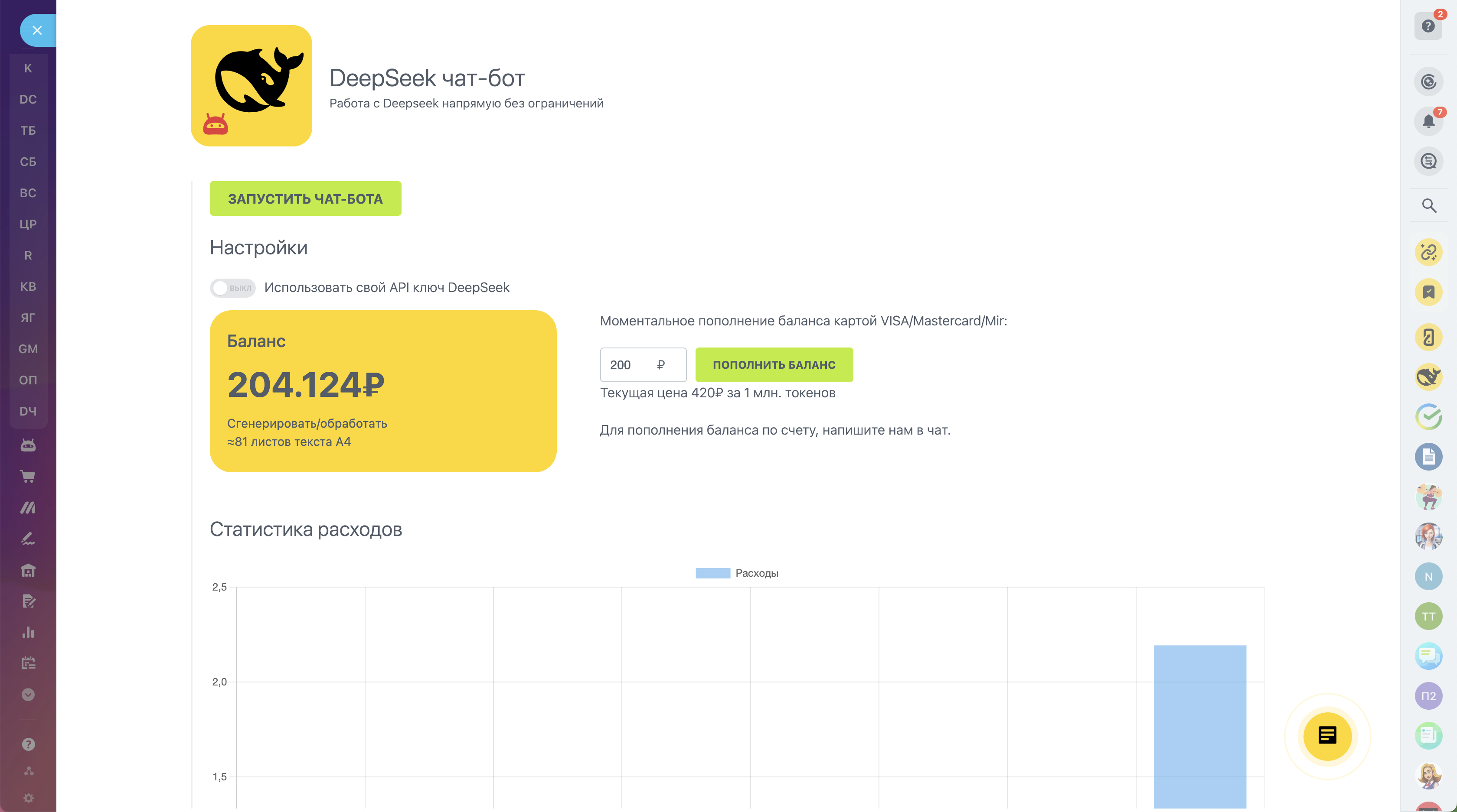 Гибкость под ваши нужды: Используйте свой API-ключ Deepseek или готовый сервис приложения — интеграция уже настроена.