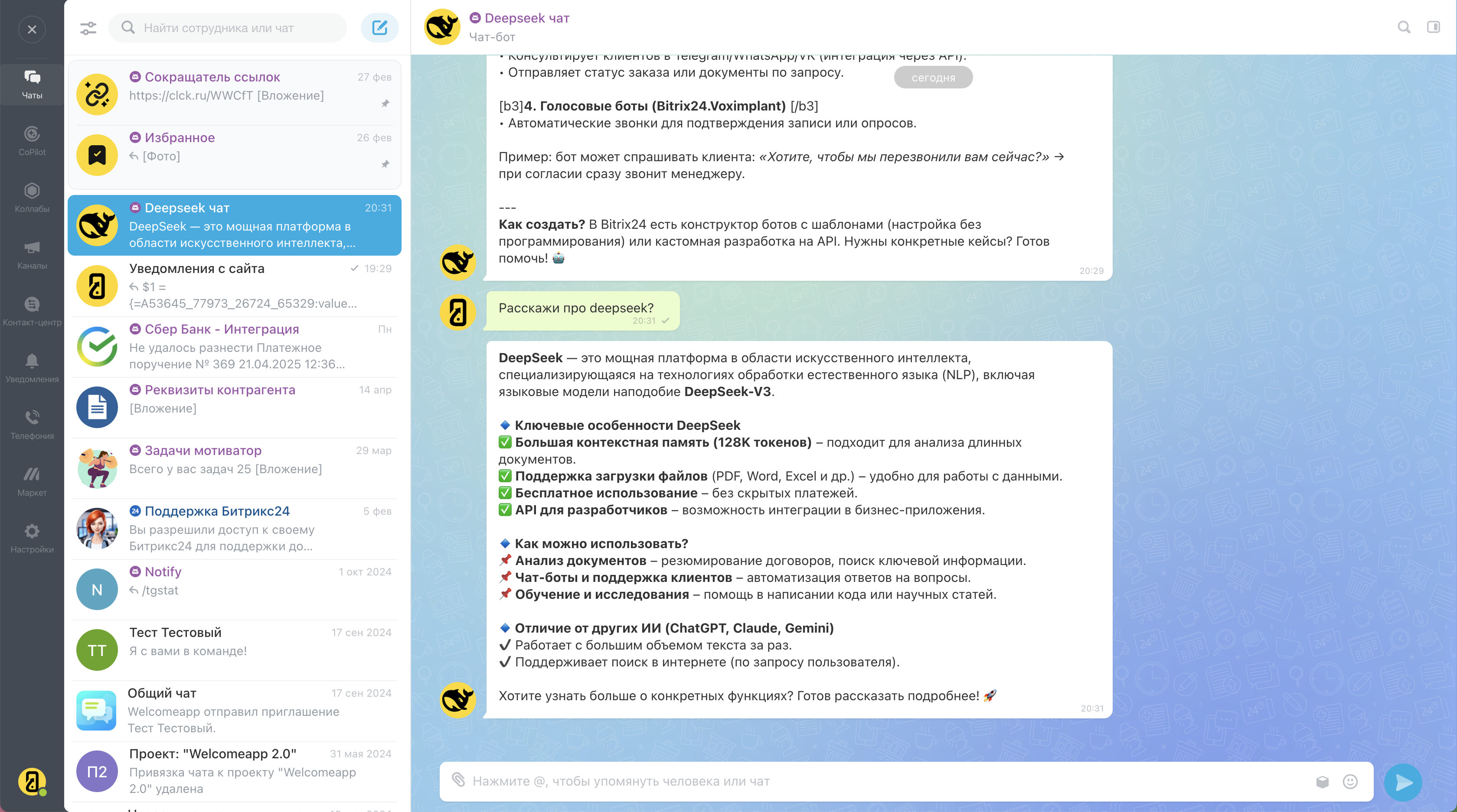 Прямо в вашем Битрикс24 появляется чат-бот, подключённый к мощному искусственному интеллекту Deepseek. Задавайте любые вопросы, анализируйте данные, получайте прогнозы — без ограничений и сложных настроек.