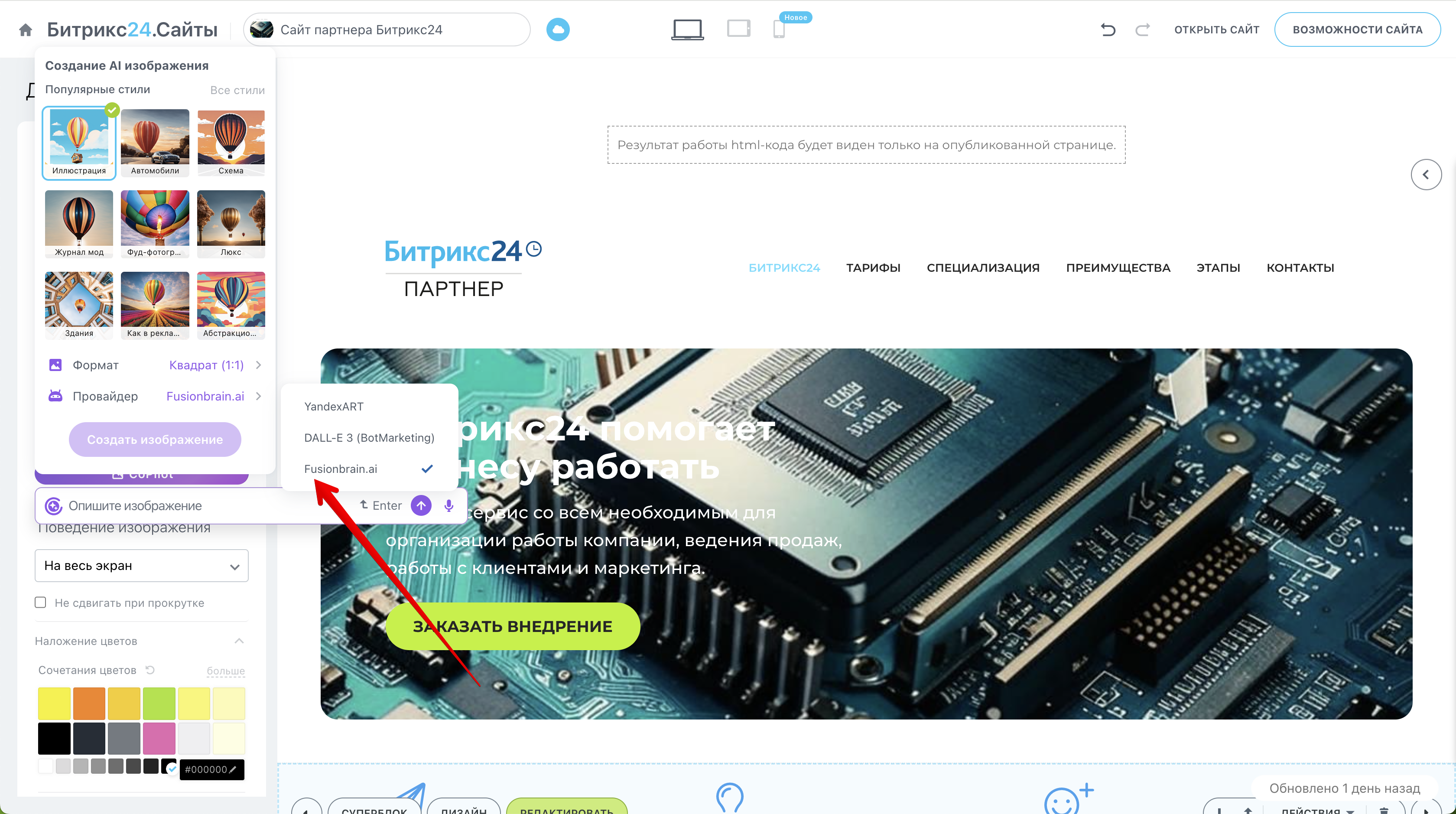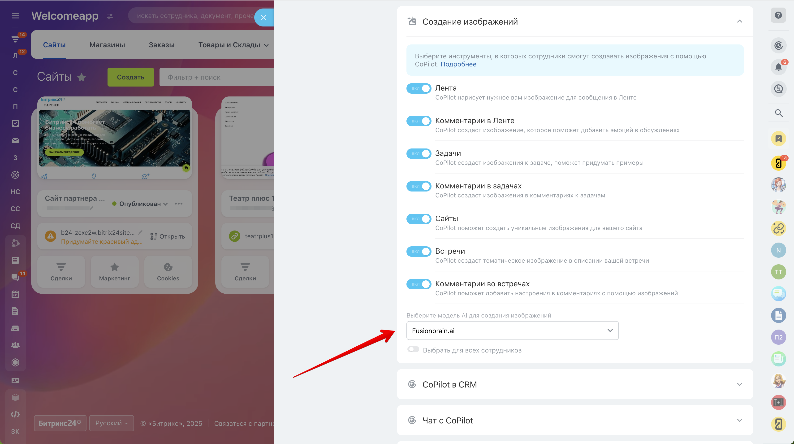 С нашим приложением вы можете легко создавать уникальные изображения прямо в нём. При установке также добавляется провайдер для генерации изображений, который нужно лишь включить в настройках Copilot вашего Битрикс24.