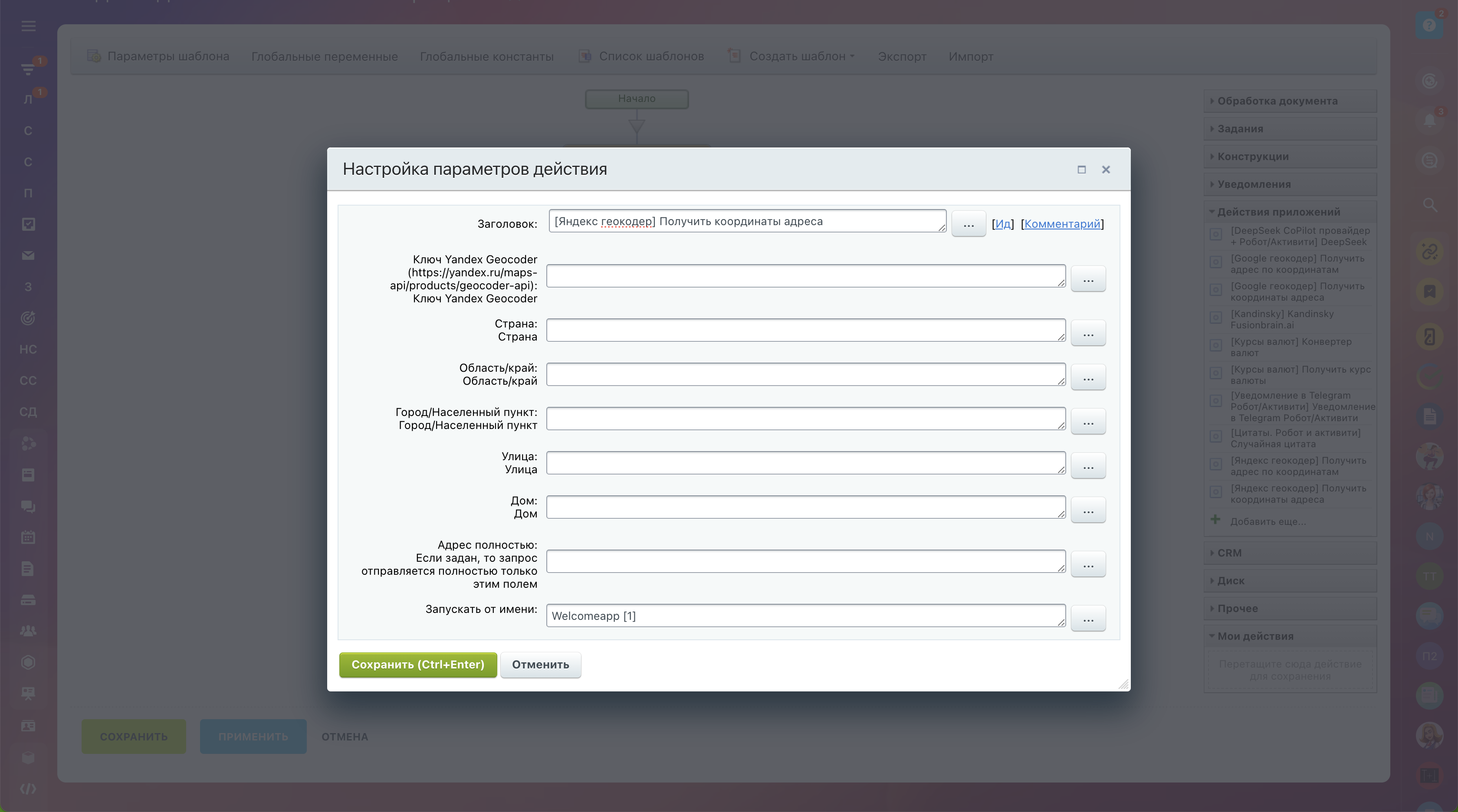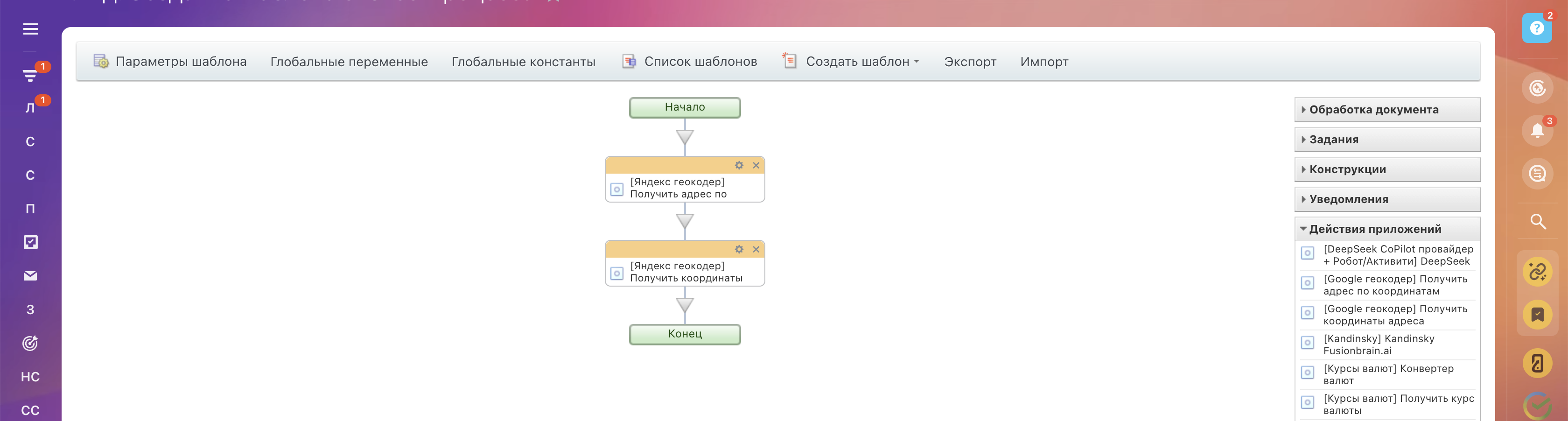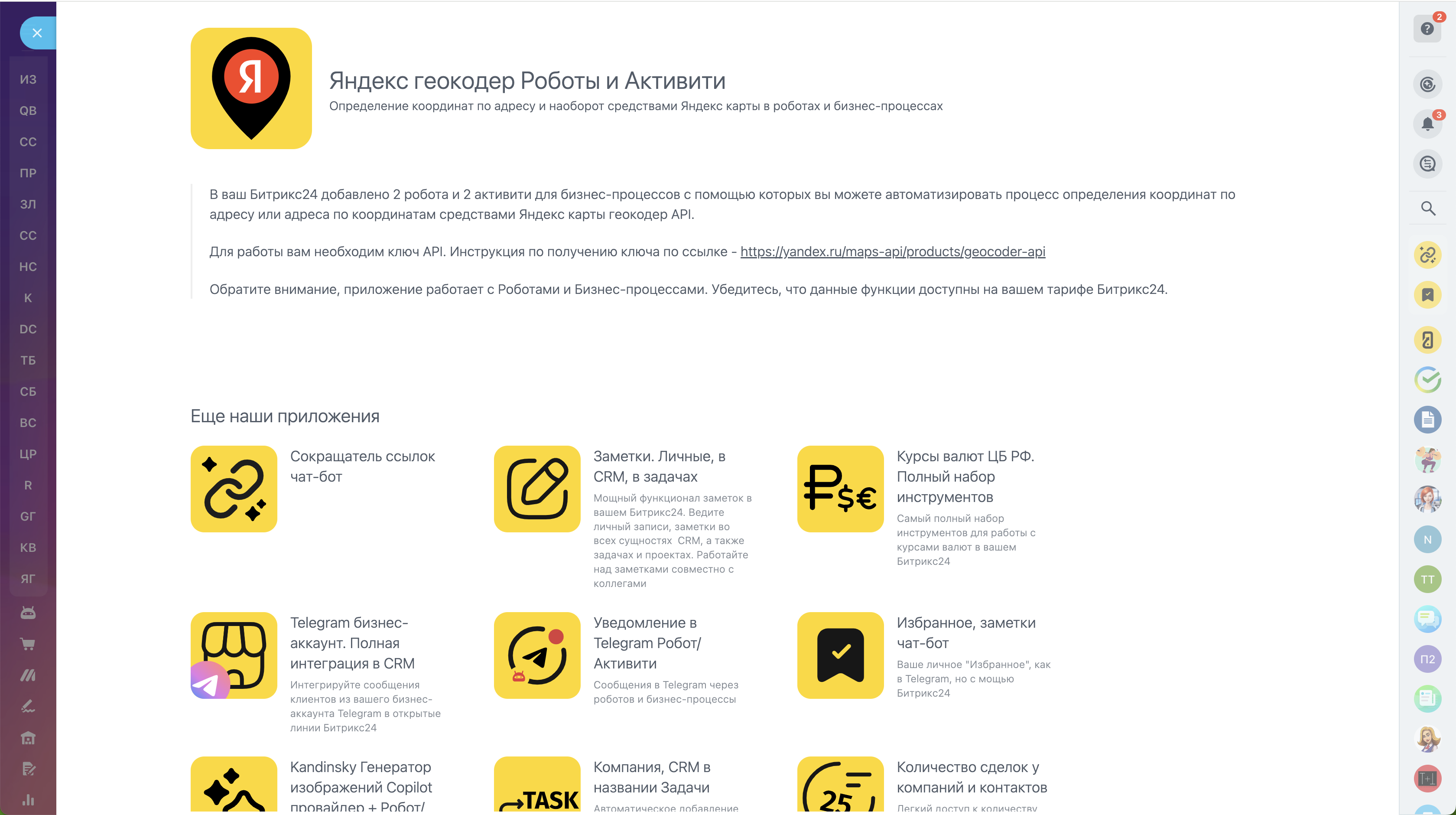 Наше приложение расширяет функционал CRM Битрикс24, добавляя два робота и две активити для бизнес-процессов. С их помощью вы можете автоматизировать преобразование адресов в географические координаты и координат в адреса, используя Яндекс Геокодер API.