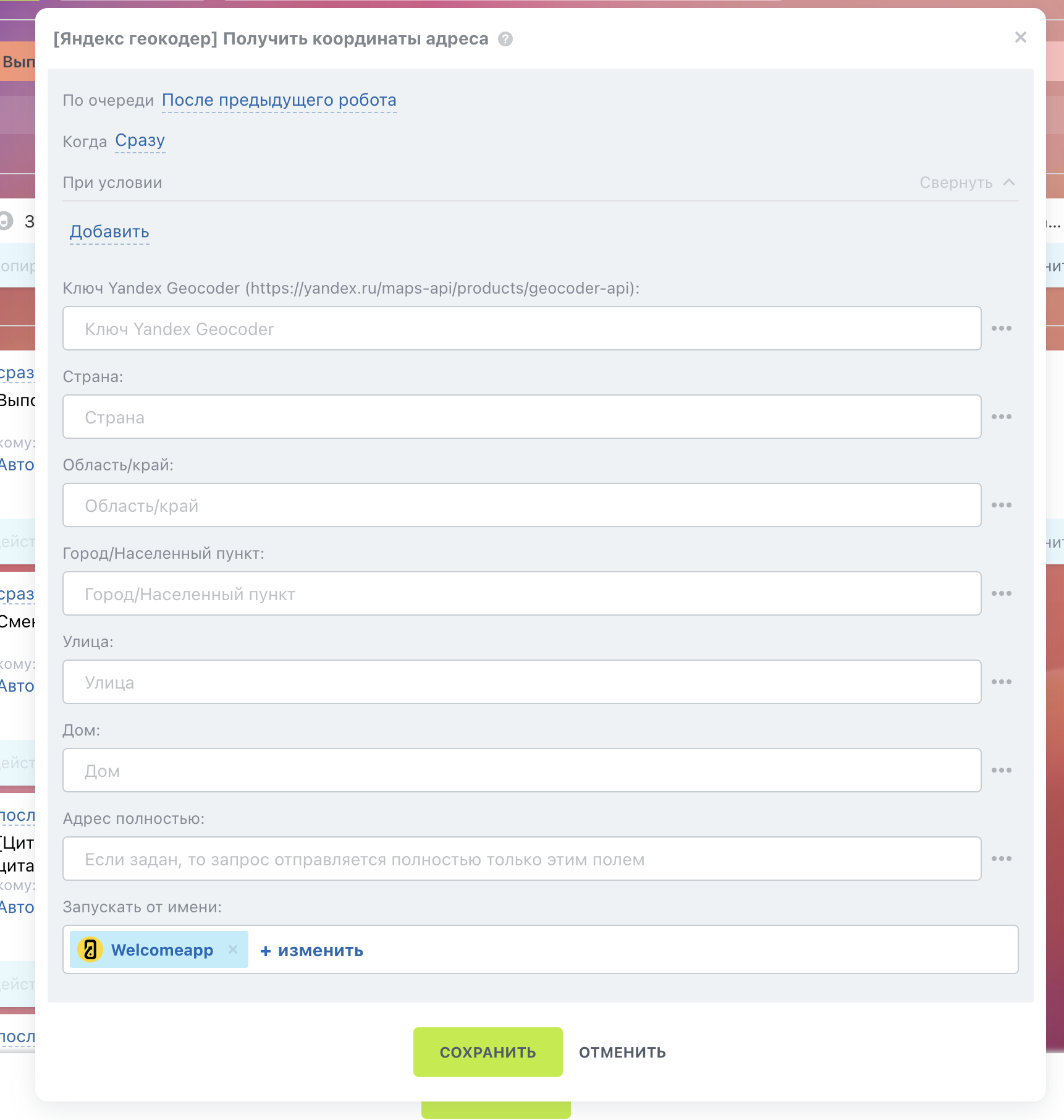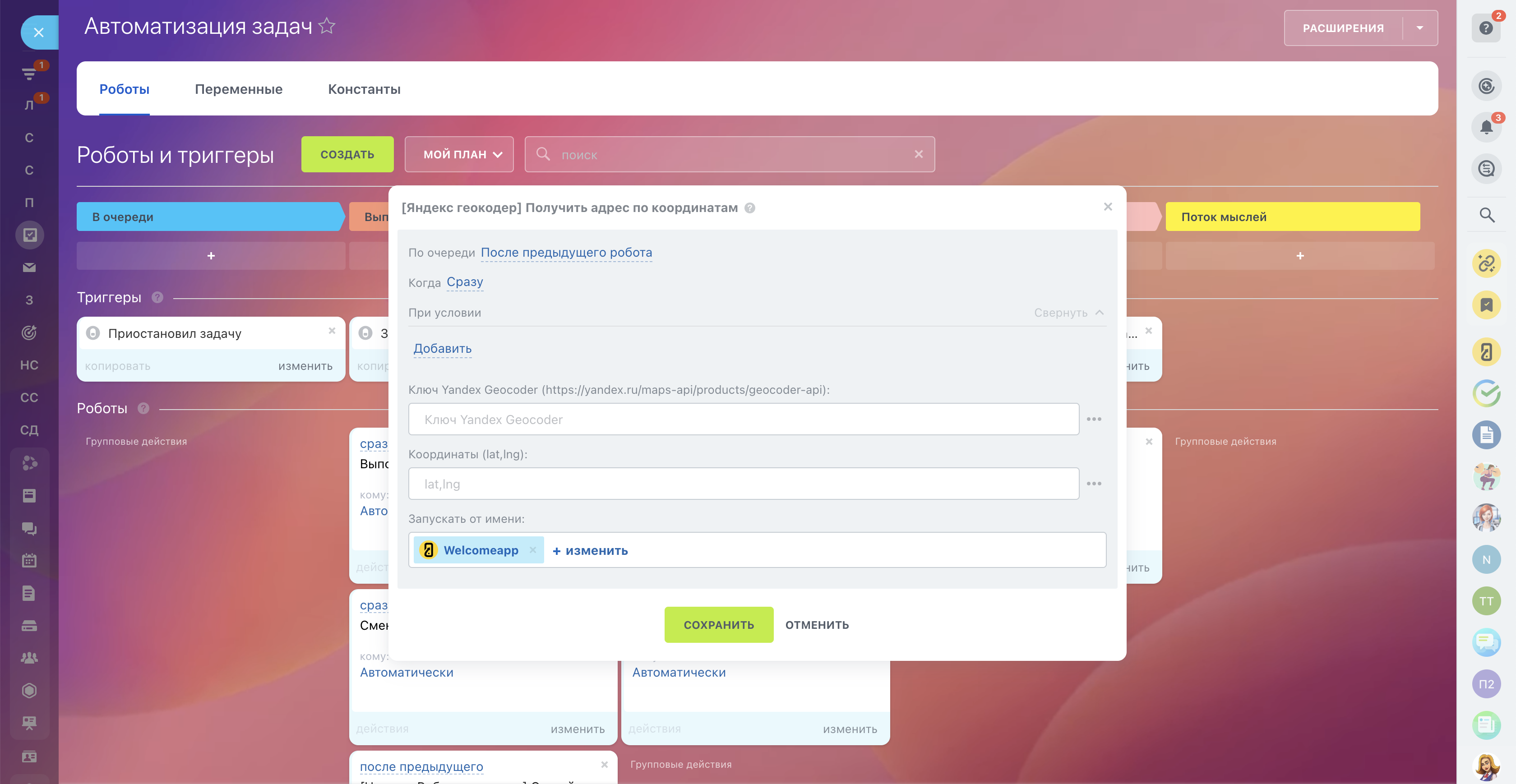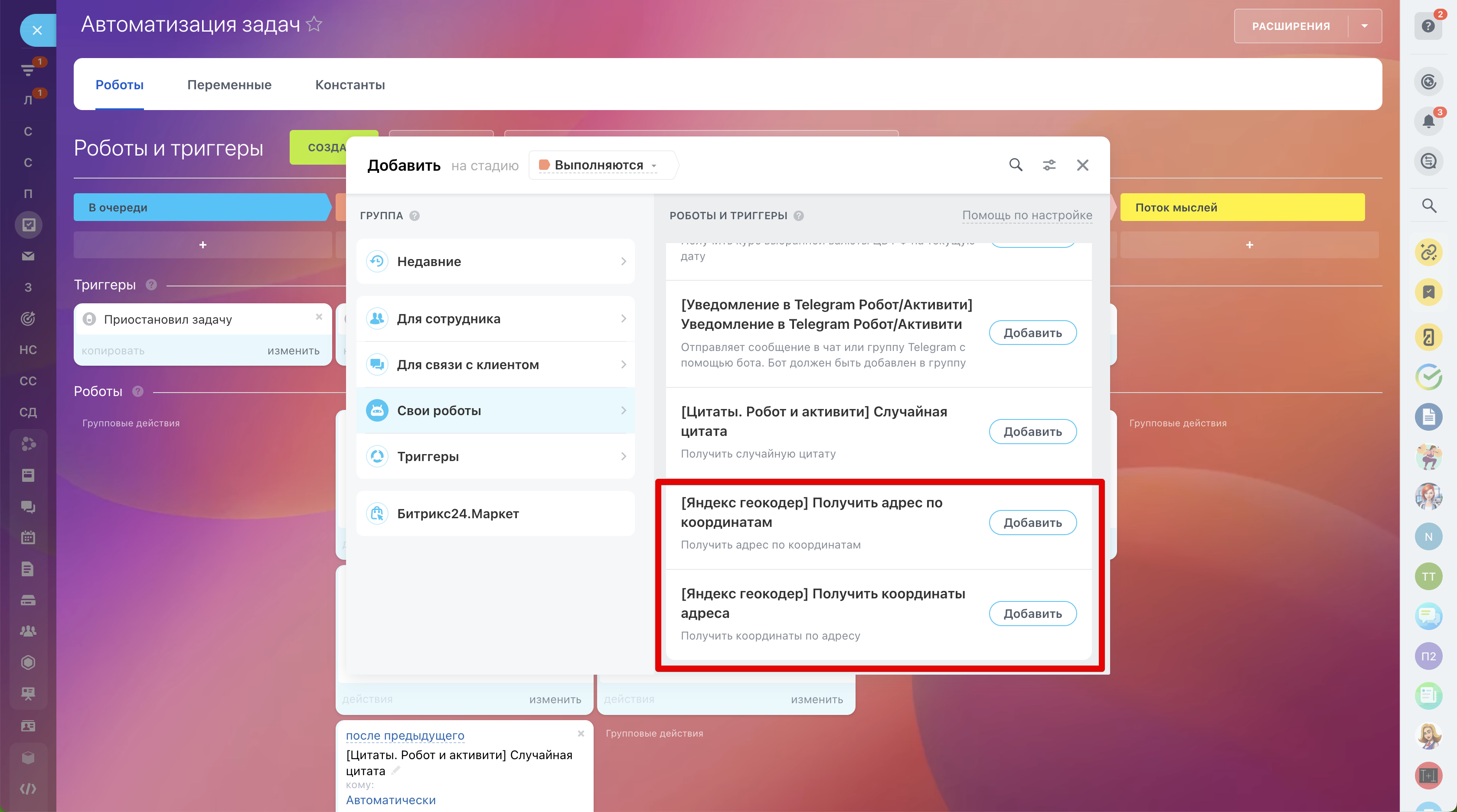 Наше приложение расширяет функционал CRM Битрикс24, добавляя два робота и две активити для бизнес-процессов. С их помощью вы можете автоматизировать преобразование адресов в географические координаты и координат в адреса, используя Яндекс Геокодер API.