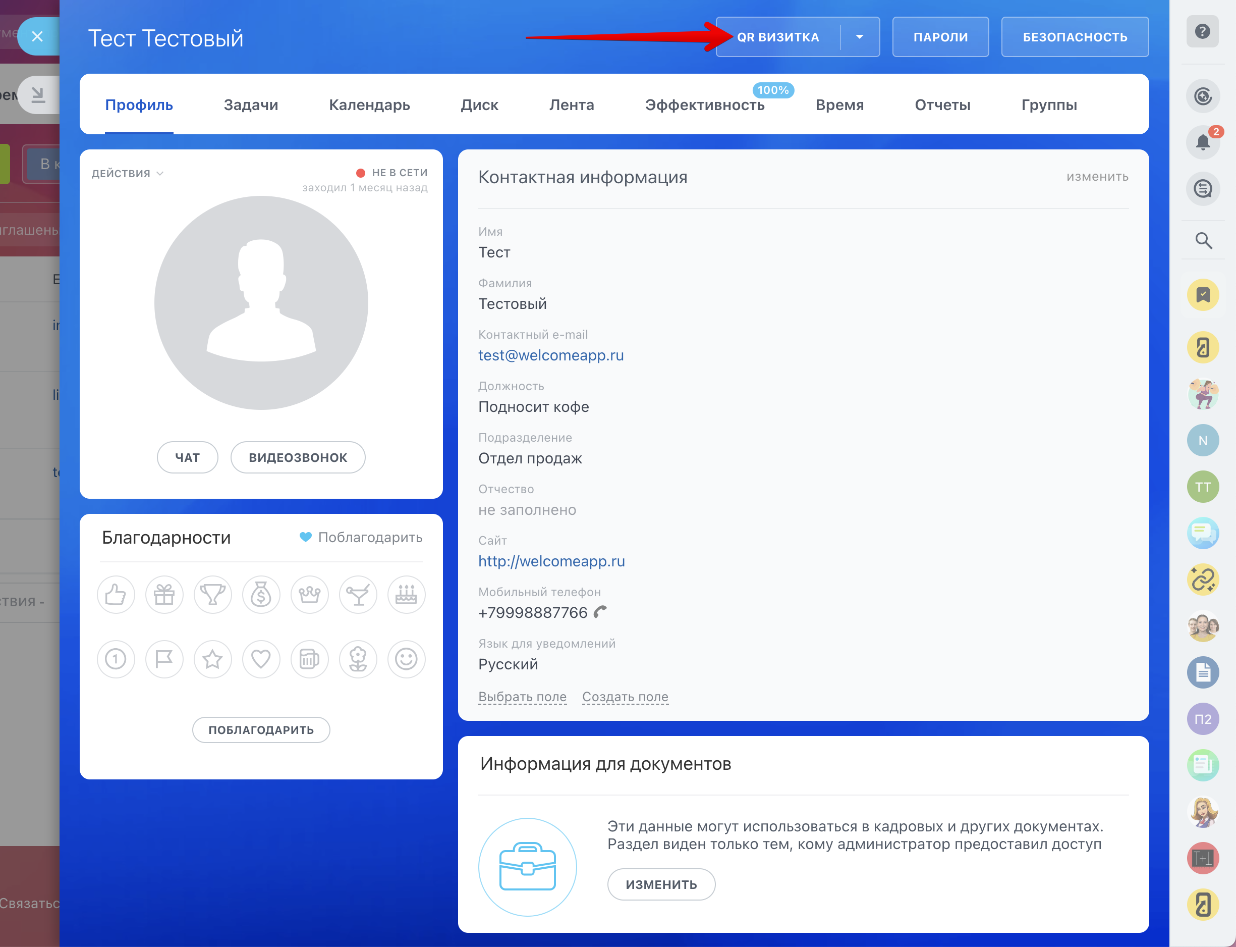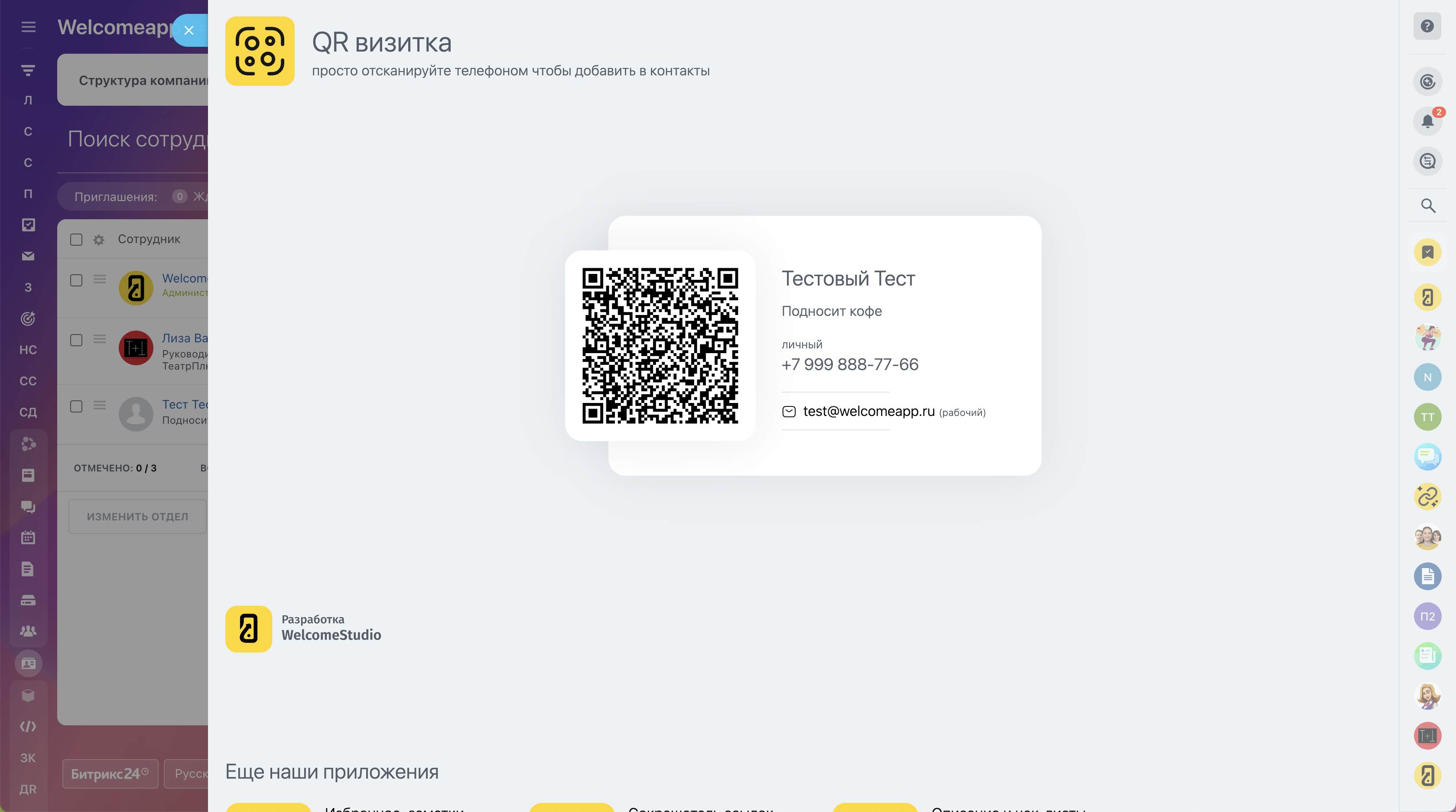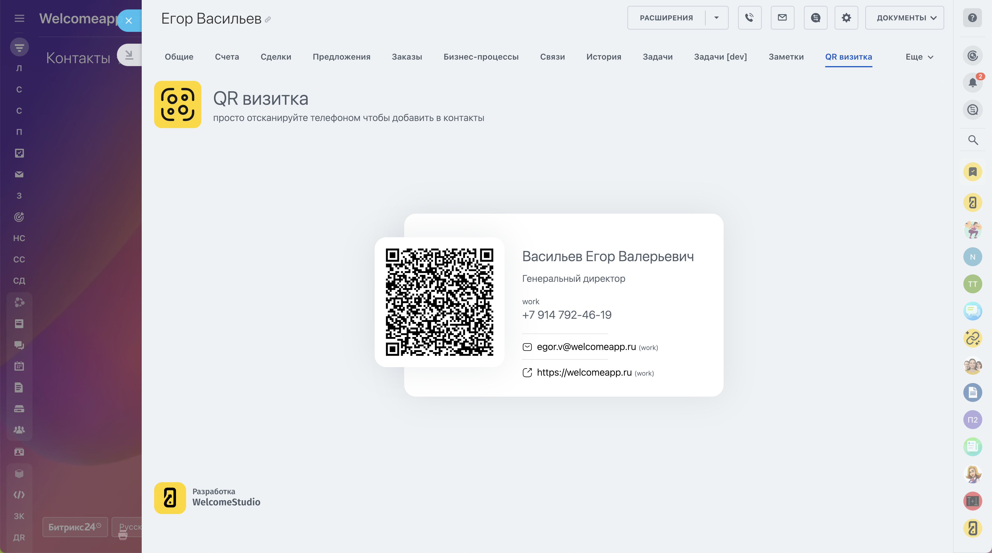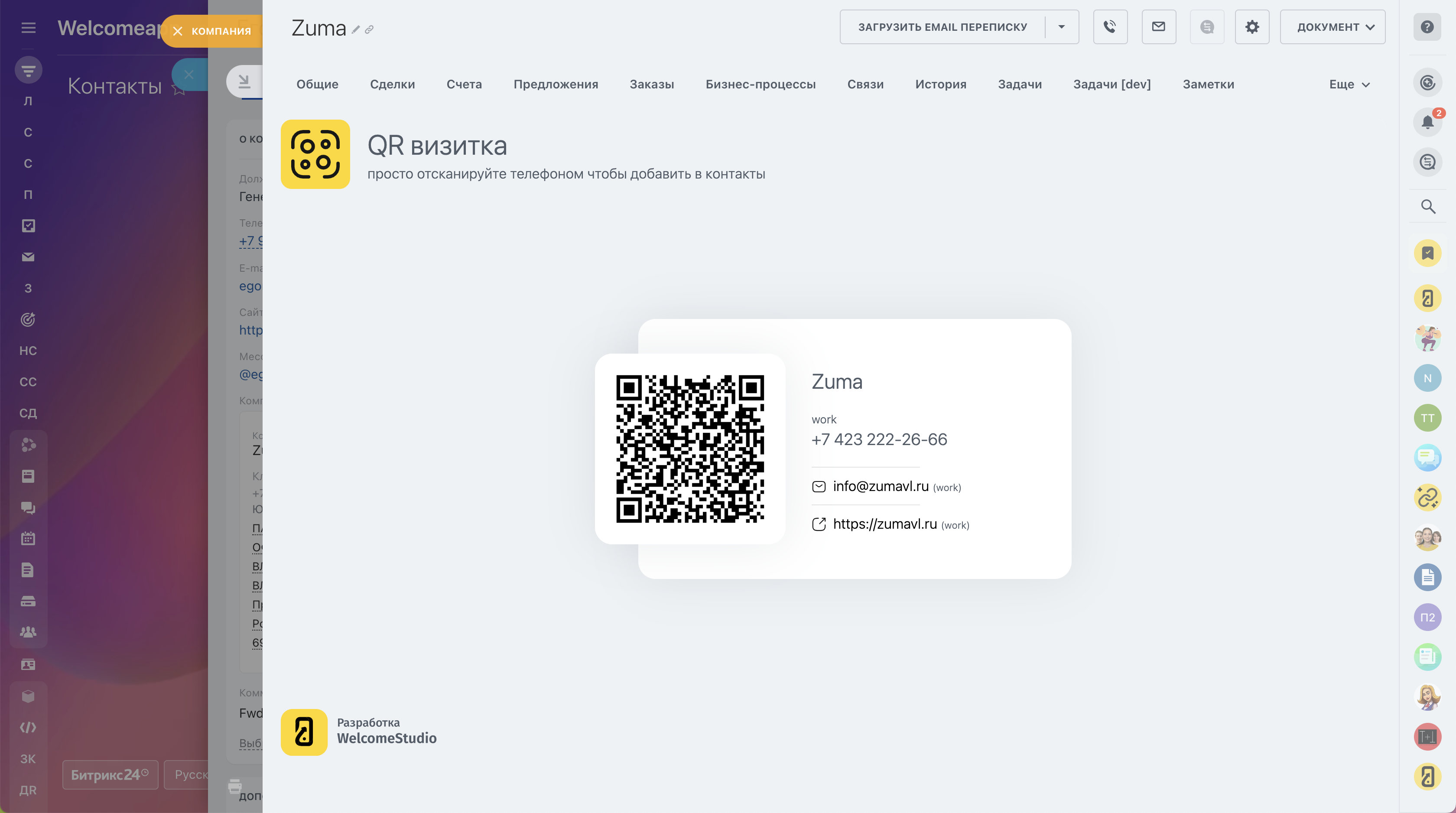 После установки приложения в карточках контакта, компании и сотрудника появляется вкладка «QR визитка». Просто перейдите на нее, и QR-код будет сгенерирован на основе данных карточки.