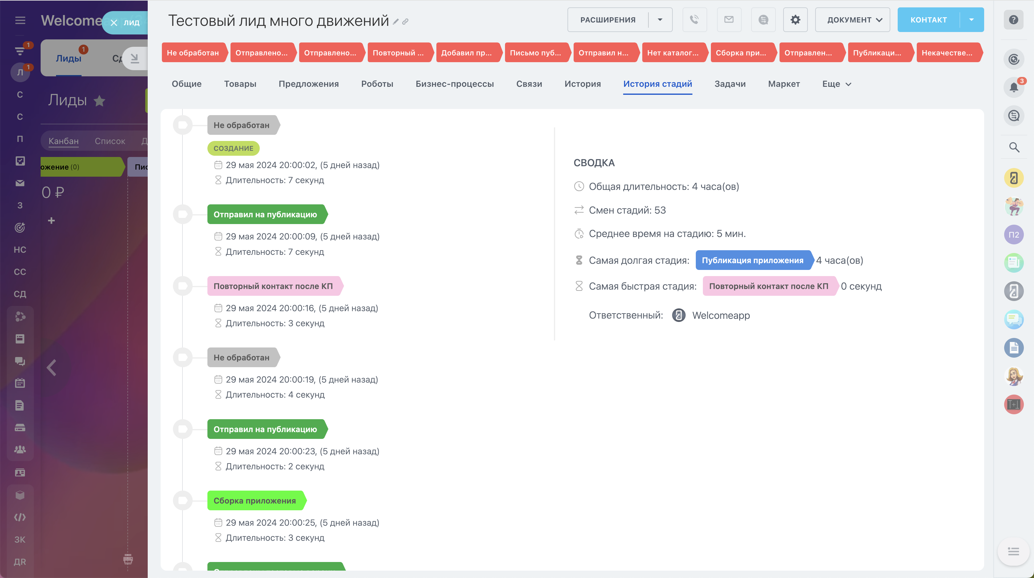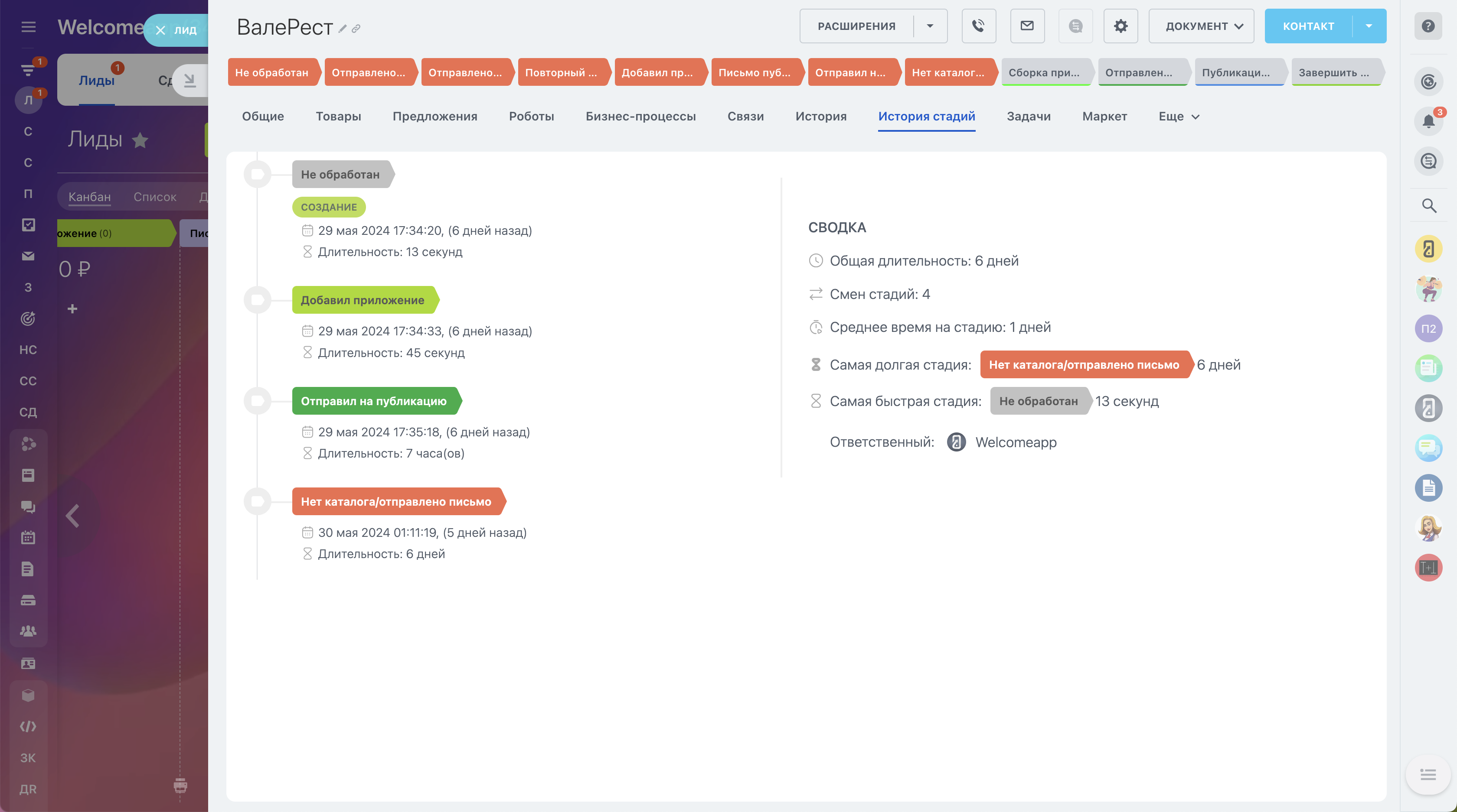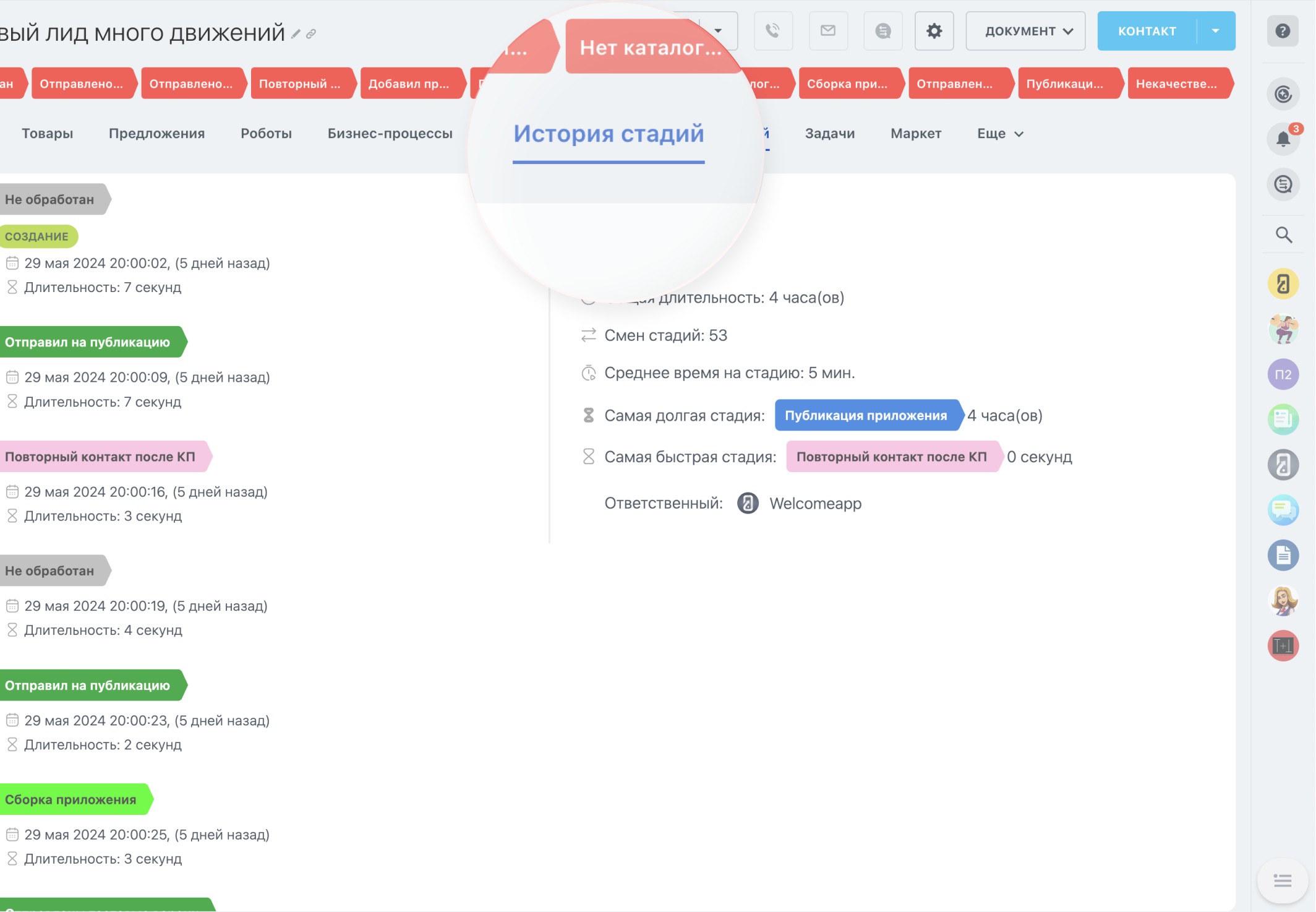 Теперь вы сможете легко отслеживать и анализировать все перемещения по стадиям, чтобы улучшить контроль и повысить продуктивность.