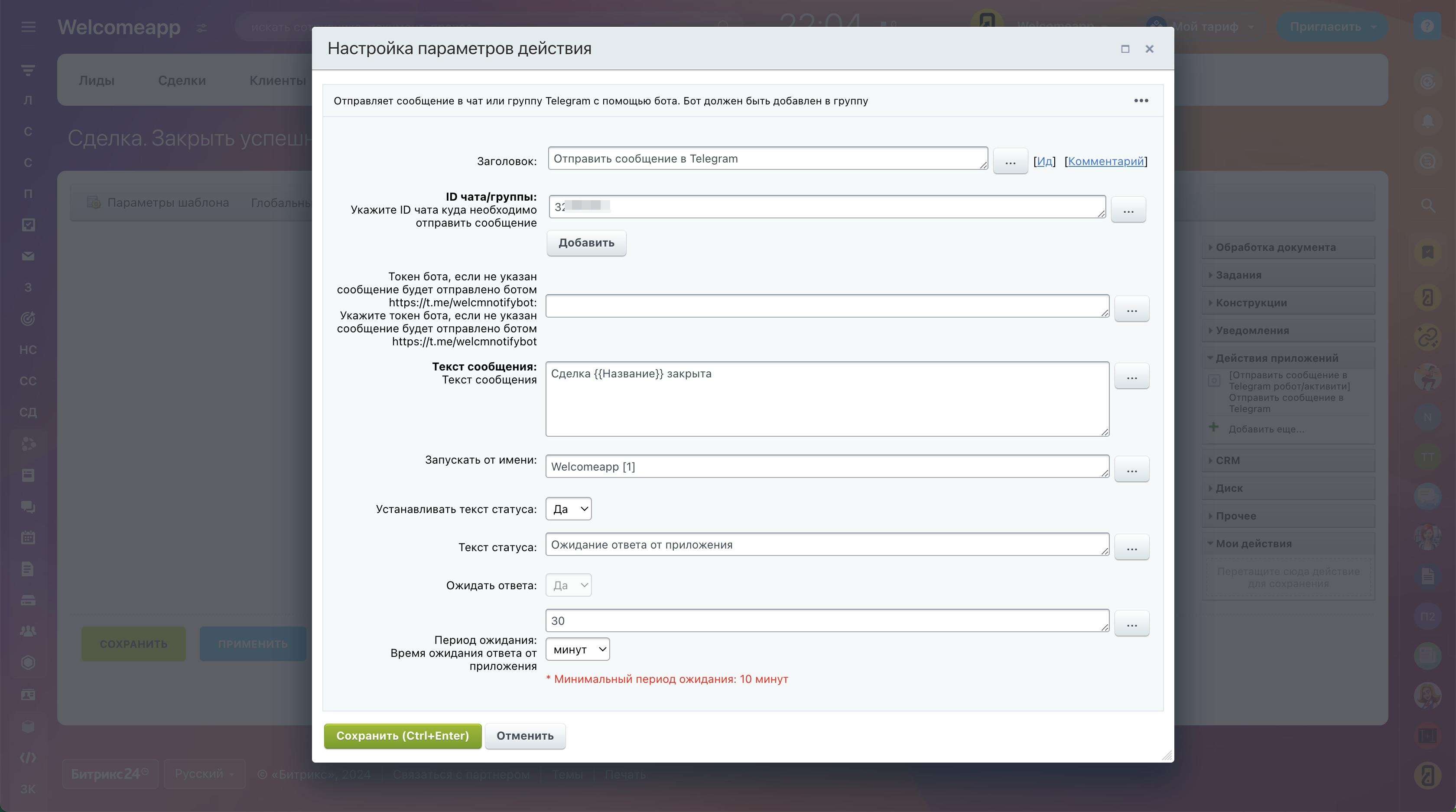 Представляем наше приложение, которое превращает Битрикс24 в мощный инструмент для общения через Telegram! Теперь вы можете отправлять сообщения прямо из Битрикс24 в чаты и группы Telegram, используя роботов и бизнес-процессы.