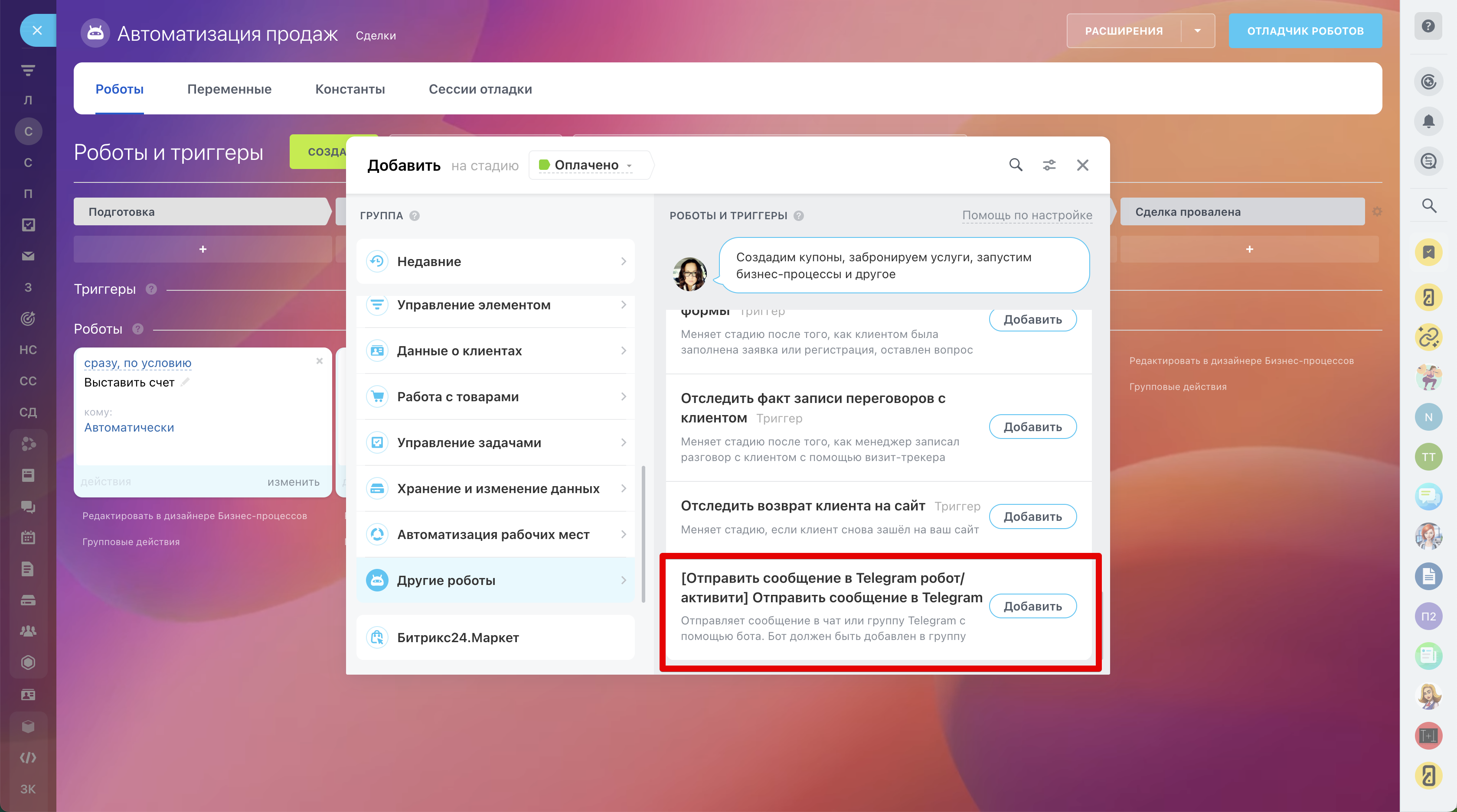 Важно: Убедитесь, что роботы и бизнес-процессы доступны на вашем тарифе Битрикс24.