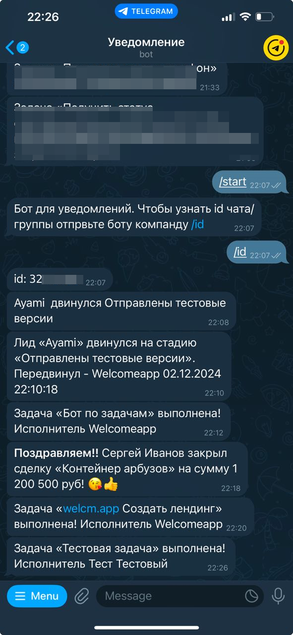 - Узнайте ID чата или группы, отправив боту команду /id и скопировав ответ.