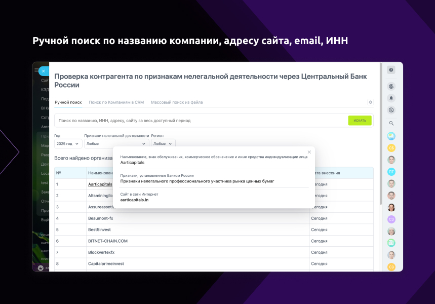 Ручной поиск по названию компании, адресу сайта, email, ИНН.