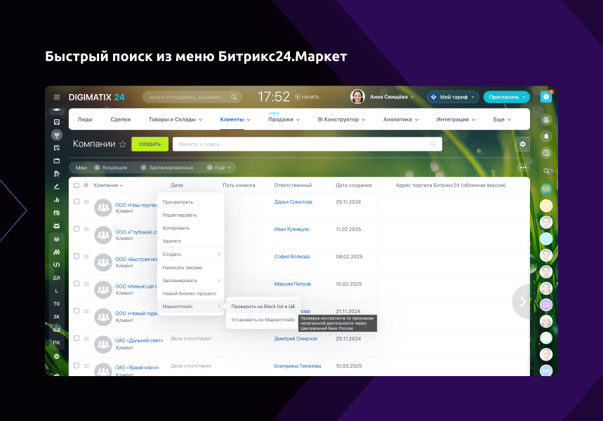 Быстрый поиск (в 1 клик) из меню (Битрикс24.Маркет -> Проверить на Black list в ЦБ) в списке компаний
