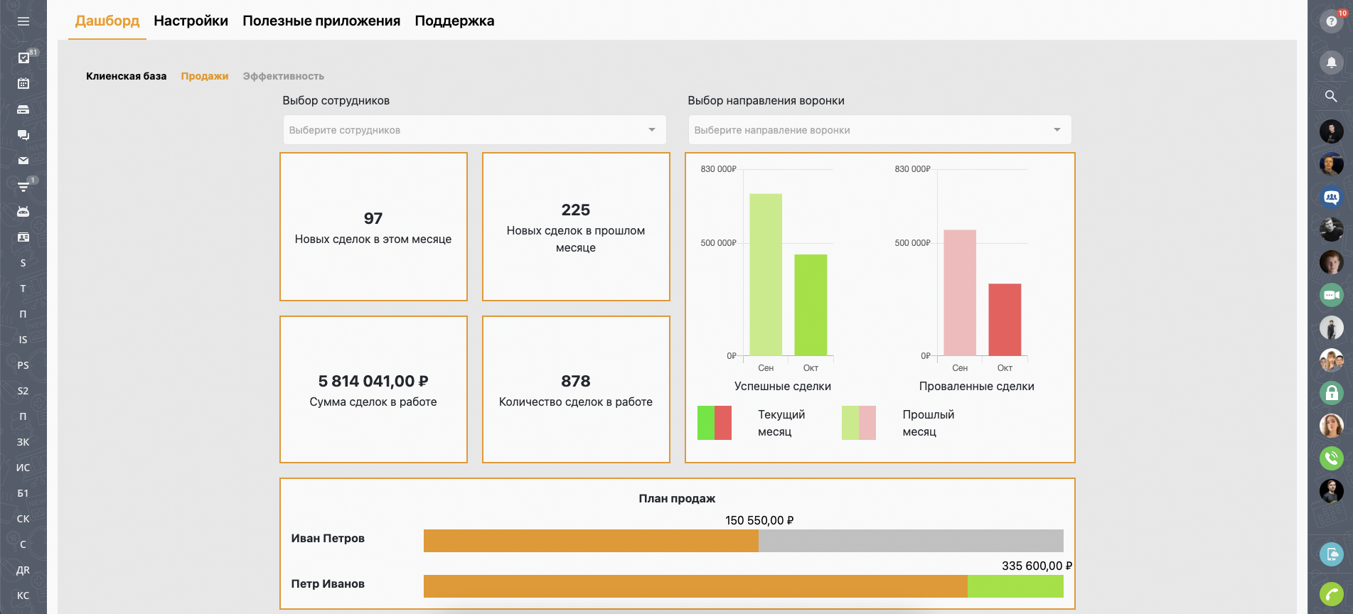 Для каждого менеджера можно задать персональный план по продажам (сумма успешно закрытых сделок), на графике будет наглядно видно выполнение и перевыполнение плана в текущем месяце.