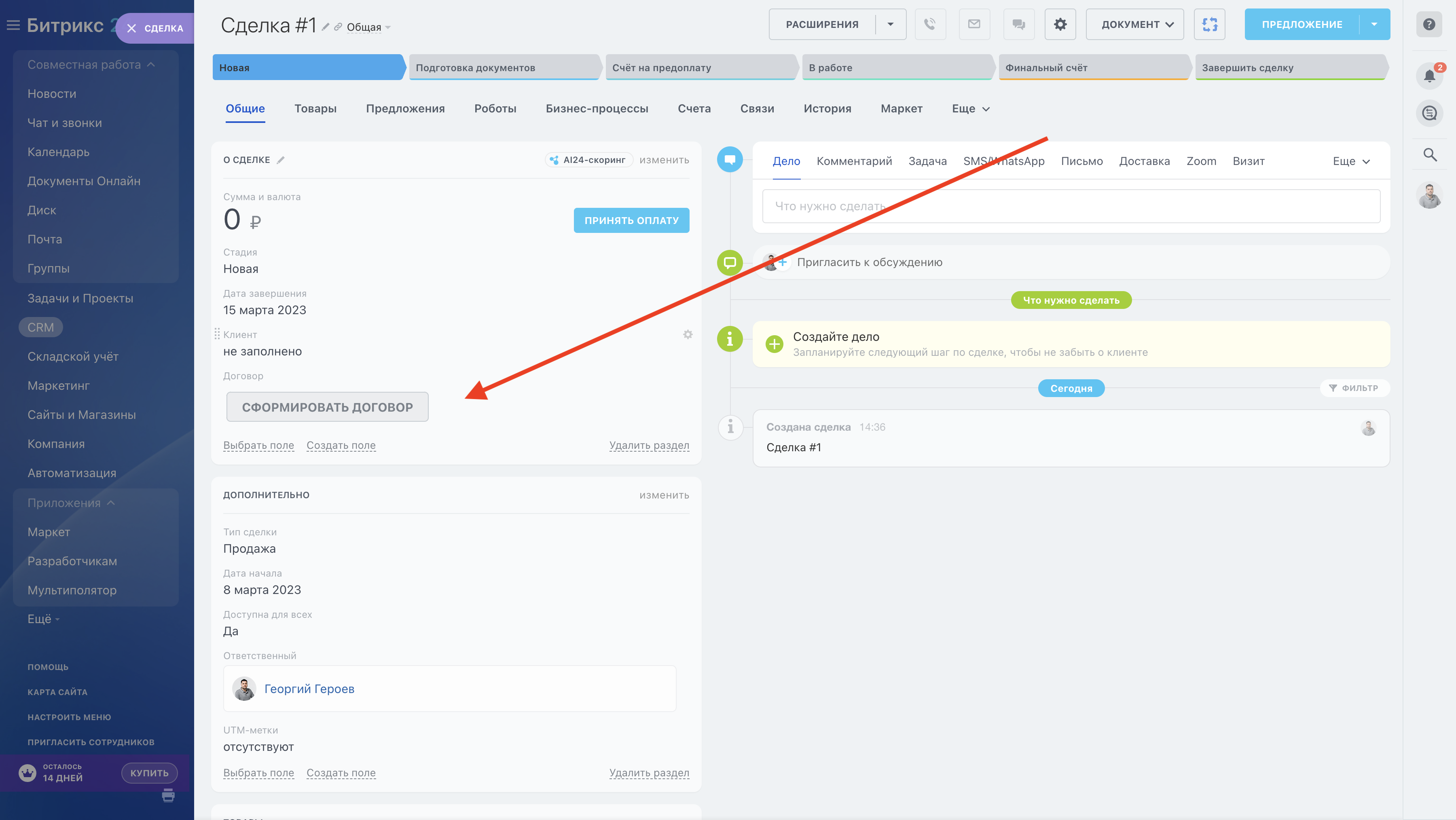 | Кнопка запуска бизнес-процесса {"name":"Сформировать договор","bizprocID":"29"} | ![]() |