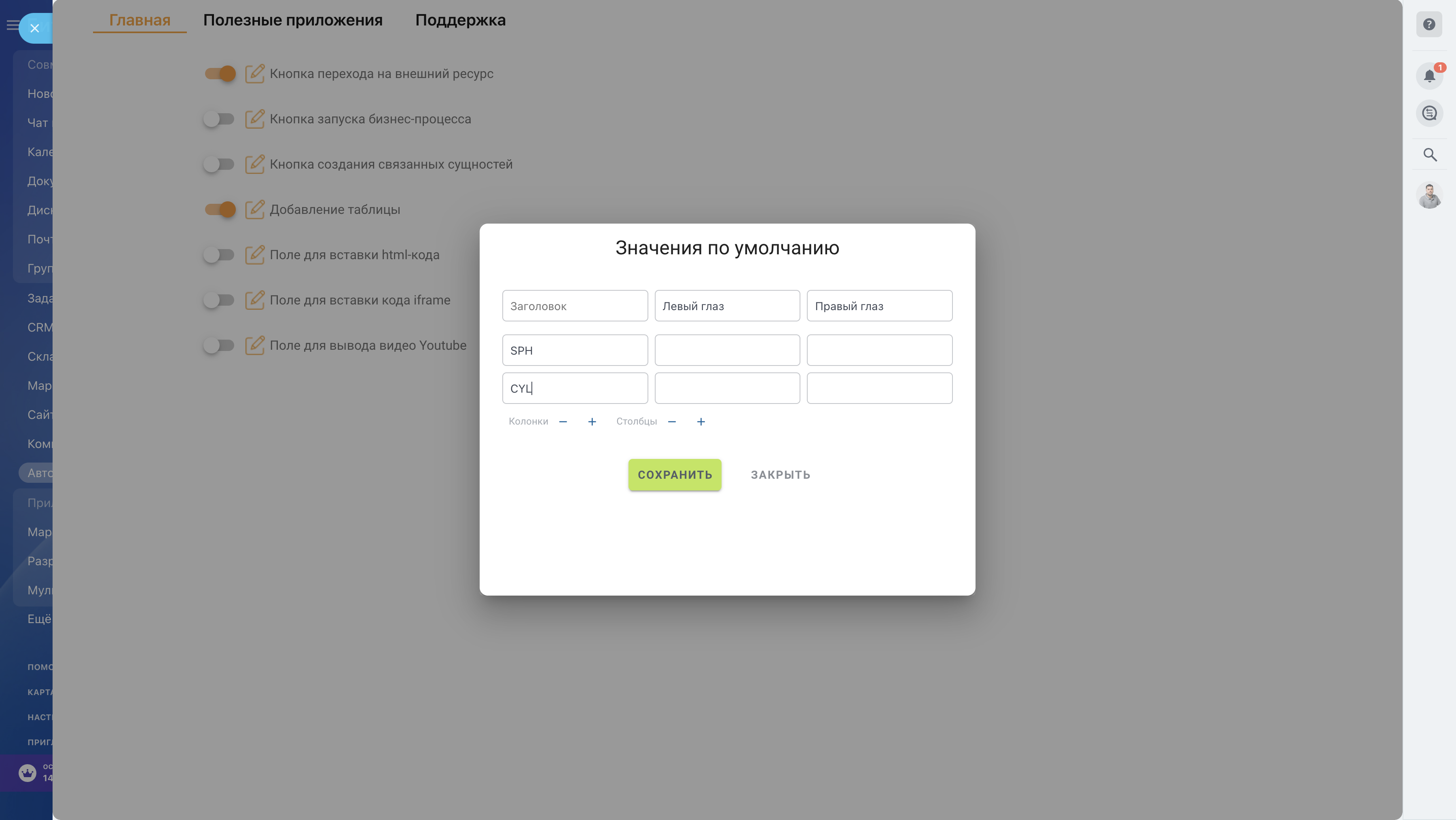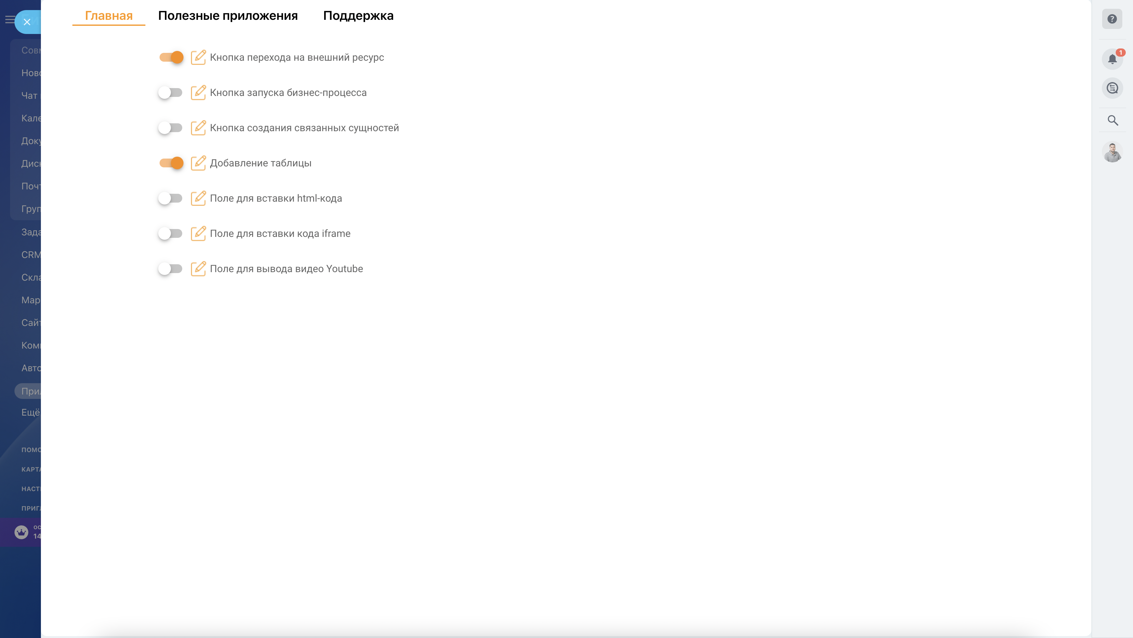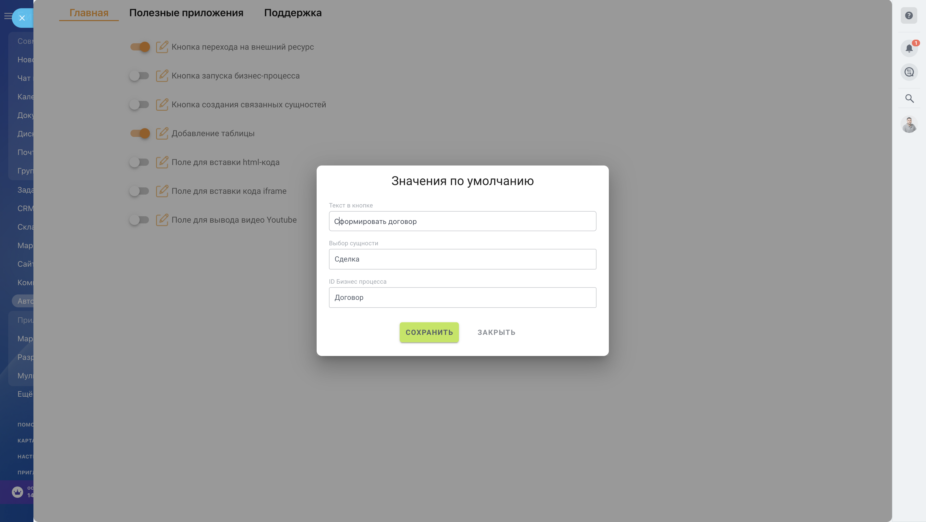 - Кнопка создания связанных сущностей - позволяет добавить кнопку, при нажатии на которую будет создаваться связанная сущность (например, создание сделки из компании)