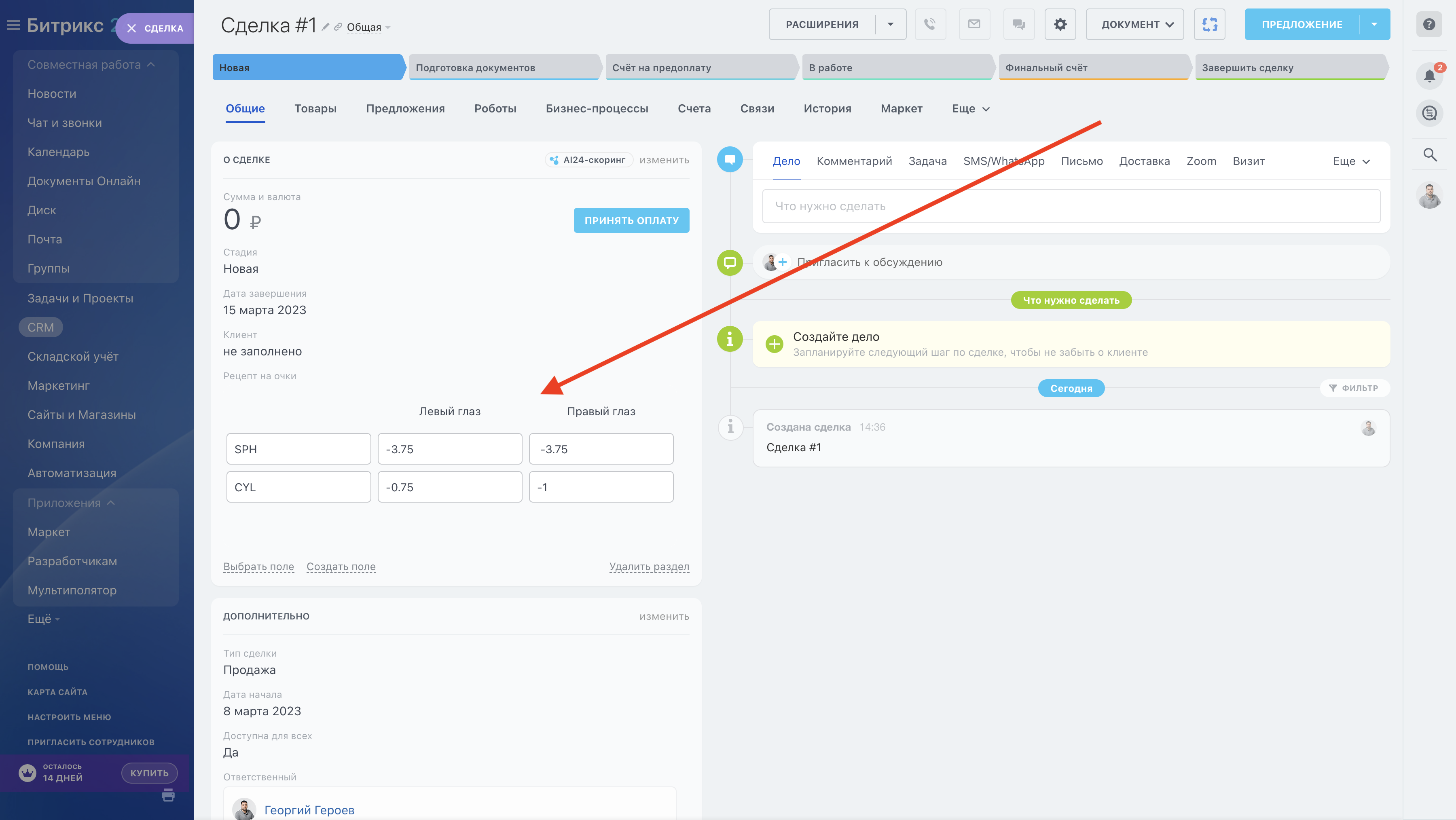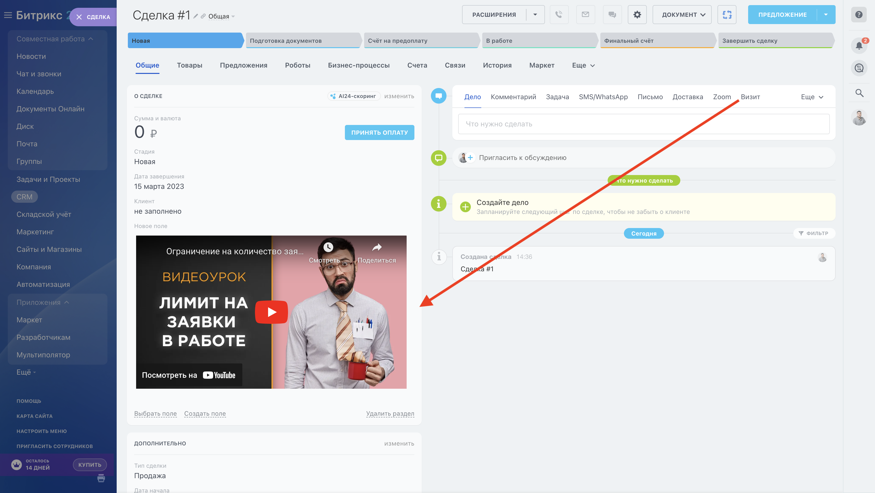 Приложение "Мультиполятор" позволяет добавлять новые типы полей, которые могут быть выбраны в левой части стандартной карточки CRM. Например, вы можете добавить кнопку для запуска любого бизнес-процесса в нужное место левой части карточки сделки или добавить шаблон таблицы, которую будет заполнять менеджер. Новые поля могут быть по умолчанию пустыми, могут быть заполнены по шаблону (в каждой новой сделке таблица будет заполнена по шаблону), а могут заполняться с помощью бизнес-процессов и роботов.