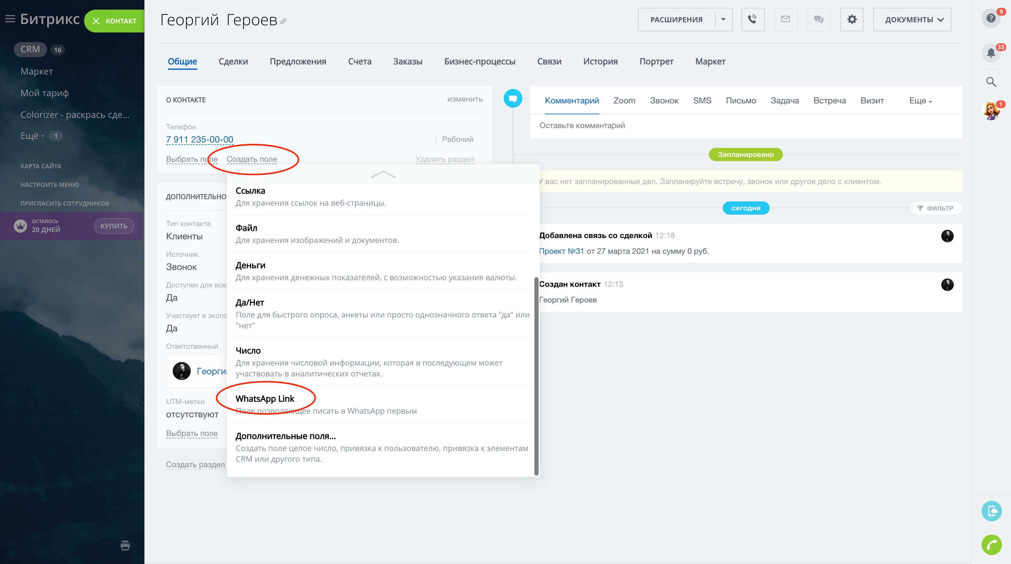 - Для отправки сообщений в каждой сущности (лид, сделка, контакт, компания) необходимо создать пользовательское поле с типом "WhatsApp Link" и вывести его в нужно место. Поле вы можете назвать произвольно, например, "Сообщение в WhatsApp".