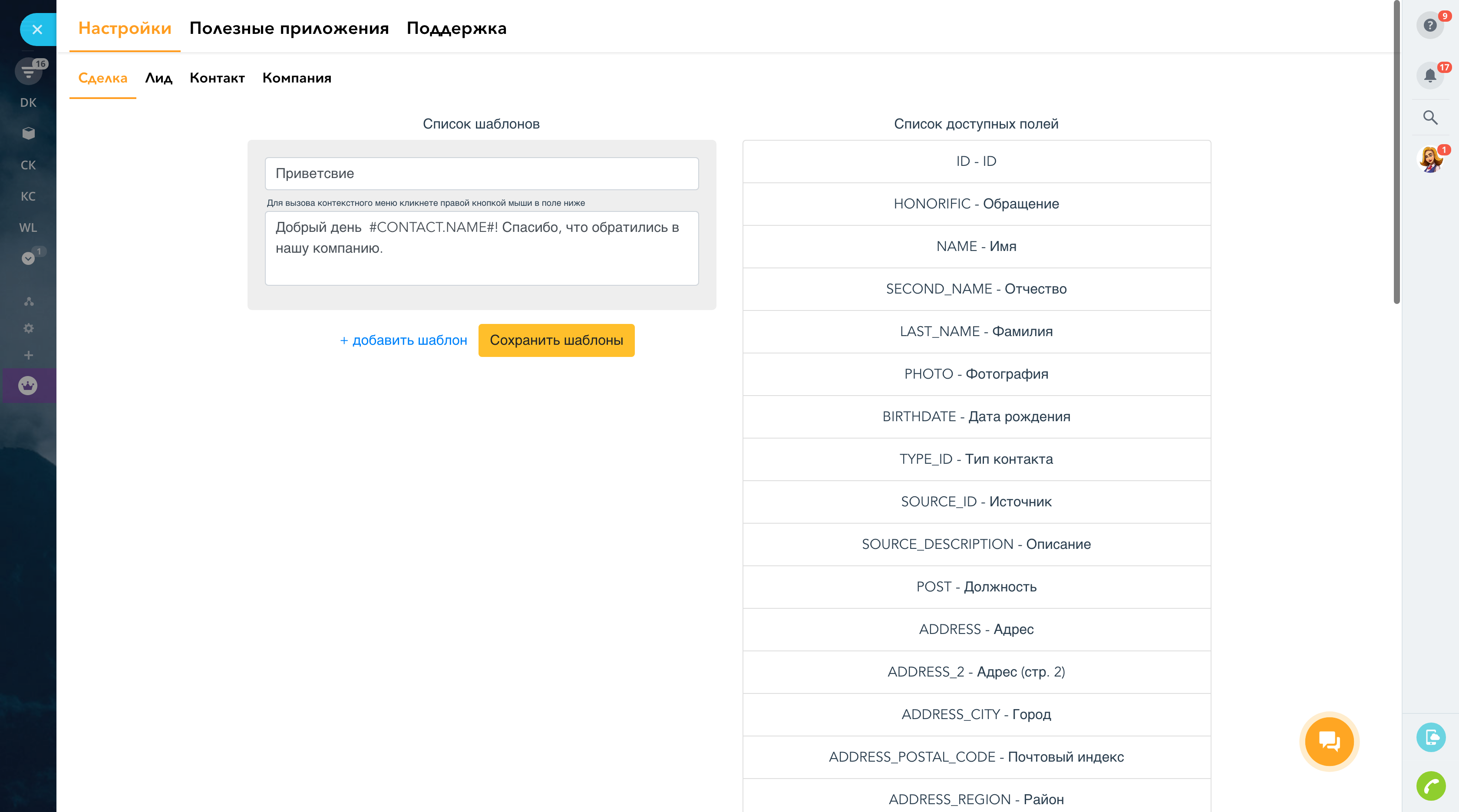 - После установка появится соответсвующий пункт в левом меню. Там можно настроить необходимые шаблоны сообщений для всех сущностей.