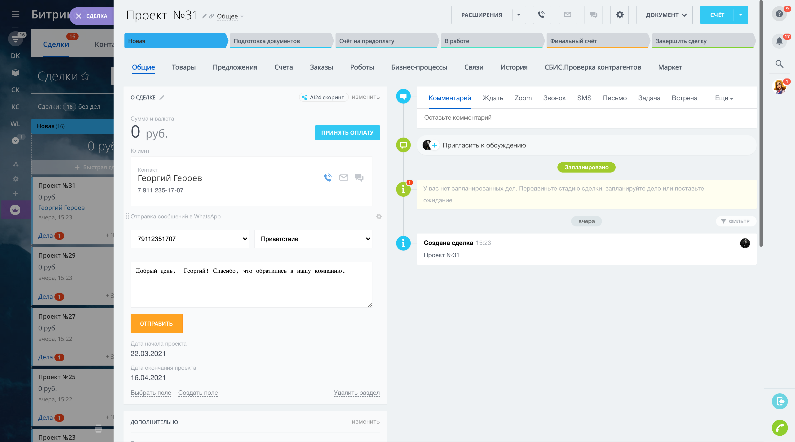Приложение позволяет отправлять сообщения клиентам в WhatsApp из карточек Лидов, Сделок, Контактов или Компаний. Вы можете писать клиентам первыми. При отправке сообщения открывается диалог с клиентом в десктоп или веб-версии приложения WhatsApp.