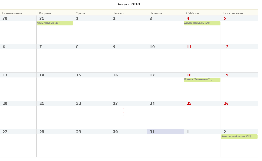 - Всплывающее окно в календаре с дополнительной информацией (ФИО, сколько исполняется лет);